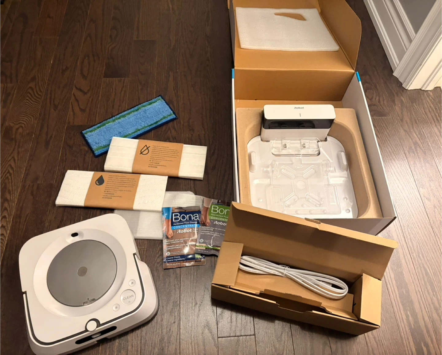 Selling a iRobot Braava Jet M6 Robot Mop! It's still in its original box and includes all the components. This robot mop is designed to mop multiple rooms and large spaces, and it learns and adapts to your home. It's Wi-Fi connected, so you can control it from your phone!