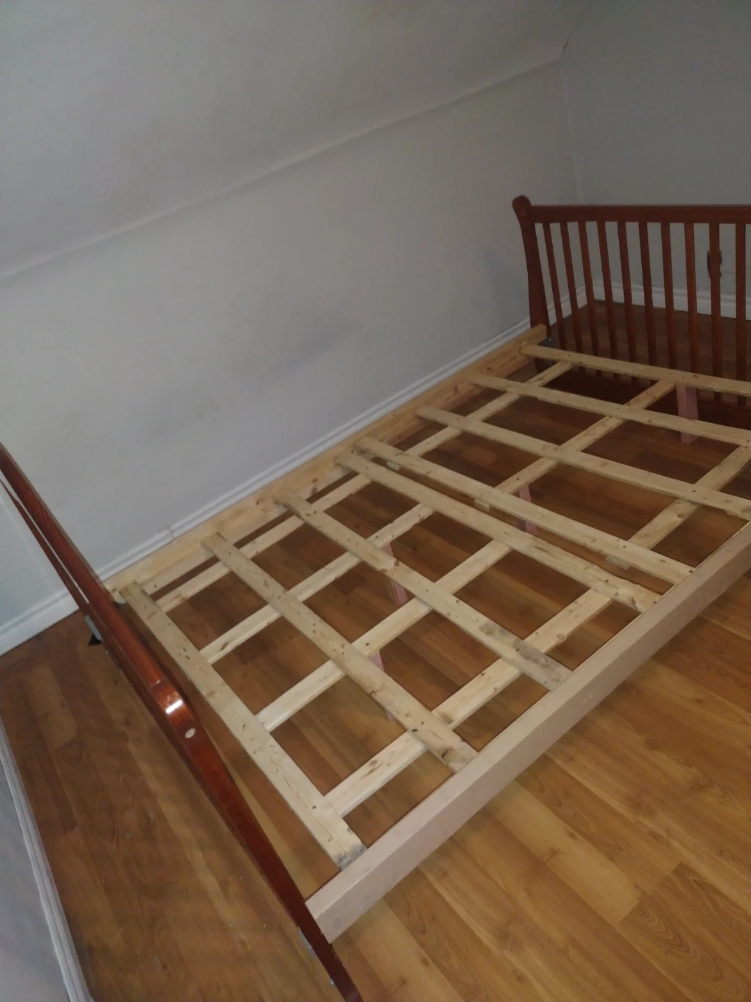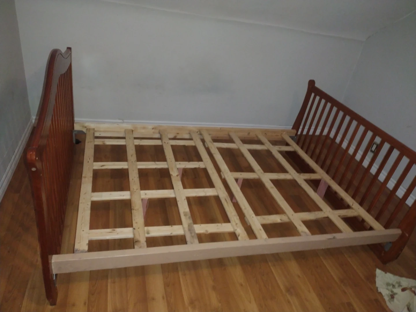 Selling a wooden bed frame in good condition! It's sturdy and ready for a new mattress. Perfect for adding a touch of warmth to your bedroom. Feel free to reach out if you're interested!