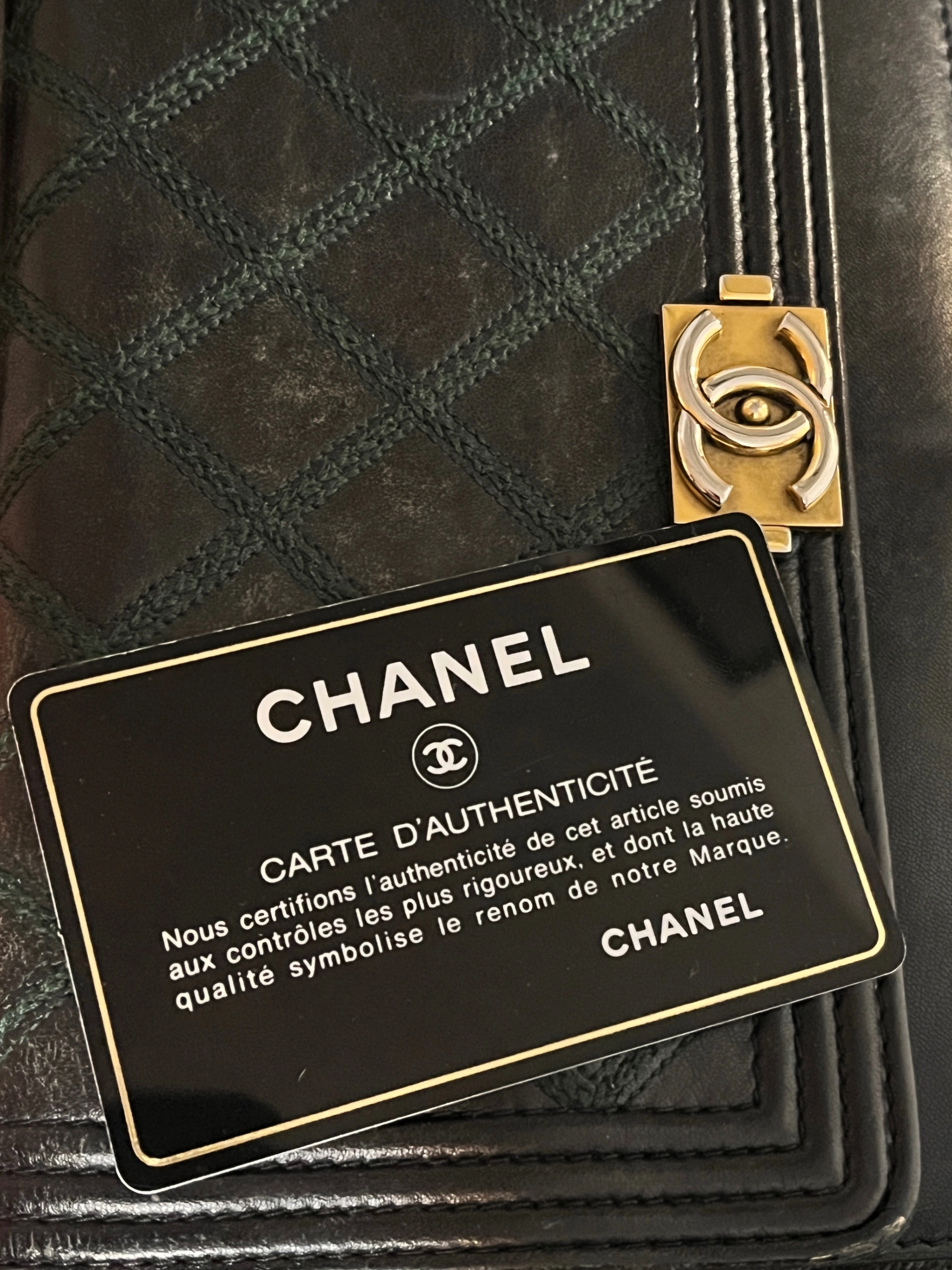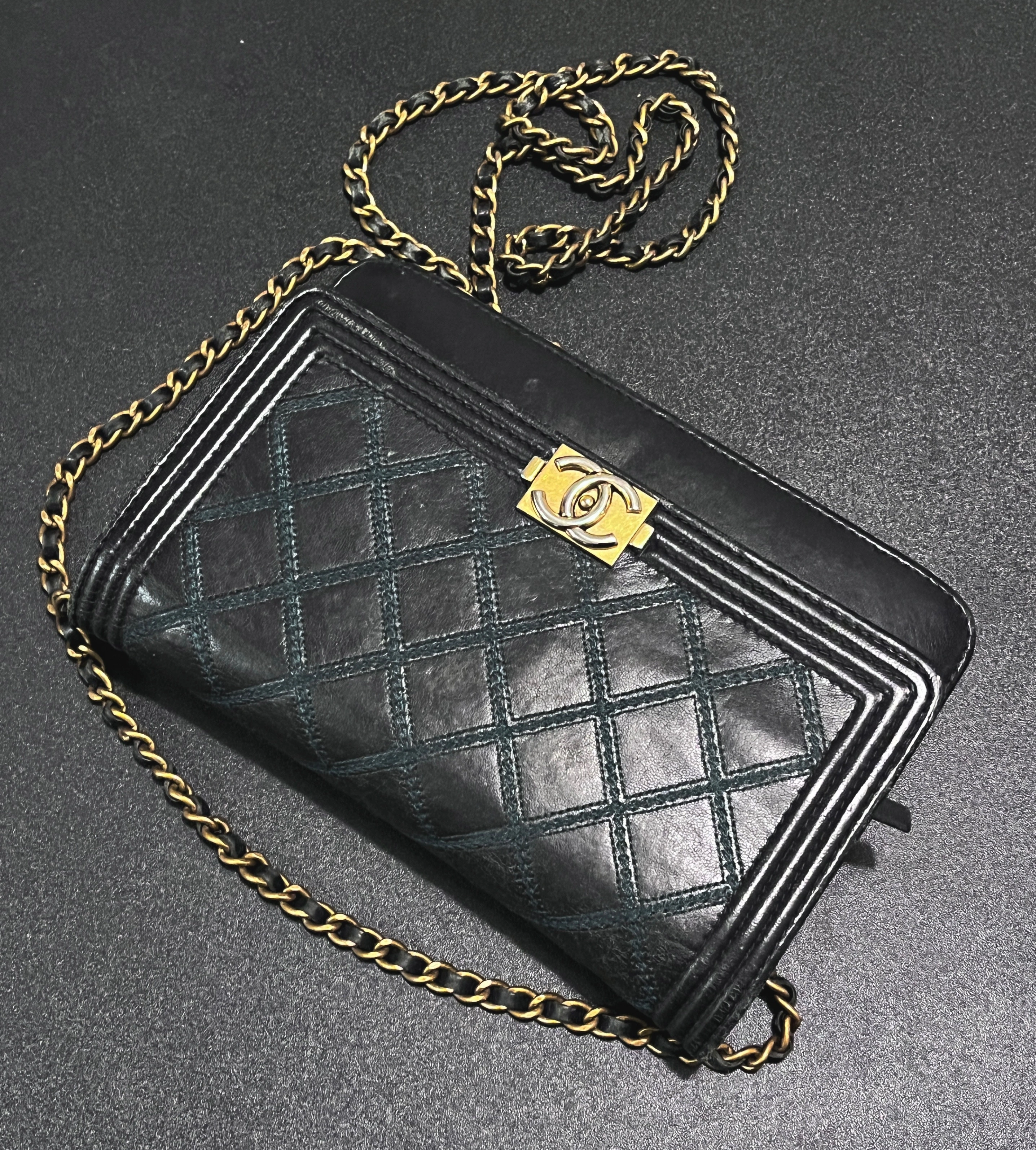The Chanel Boy wallet on a chain features a quilted leather body, a leather woven chain strap, a front flap with a push snap closure, and interior zip and slip compartments.