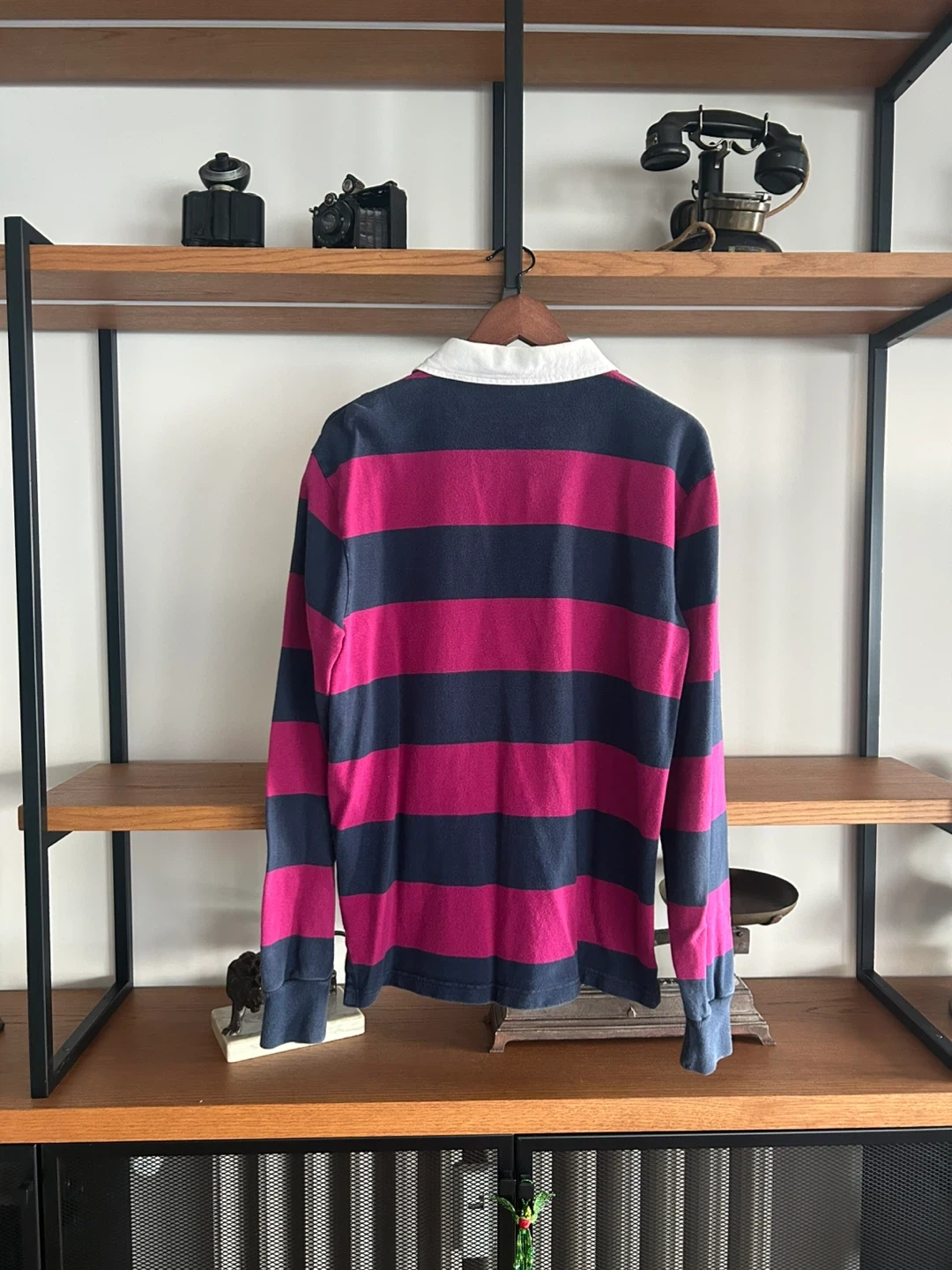 Here's a GANT rugby shirt in size L! It features a striped pattern in navy and fuchsia. Perfect for a casual, sporty look! Its never worn since i never really reached for it.