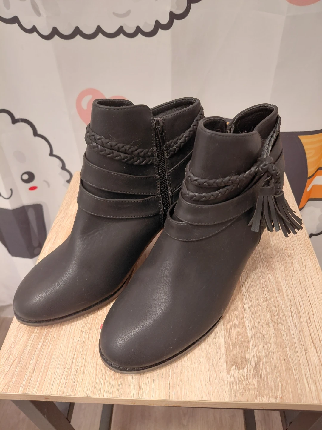 Cute pair of black ankle boots! They feature braided strap detailing and a small heel. Perfect for adding a bit of style to your everyday outfits!