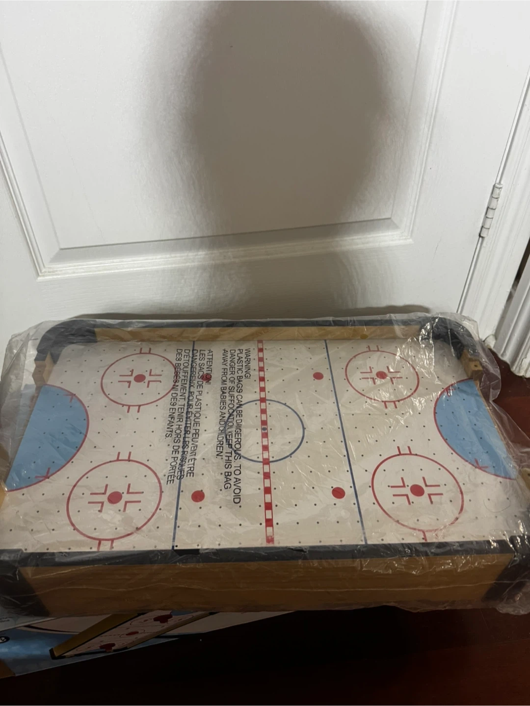 Brand new tabletop air hockey game! The compact design is perfect for any room, and it provides hours of fun. This has been opened and inspected, but never used. All parts are still sealed in the plastic.