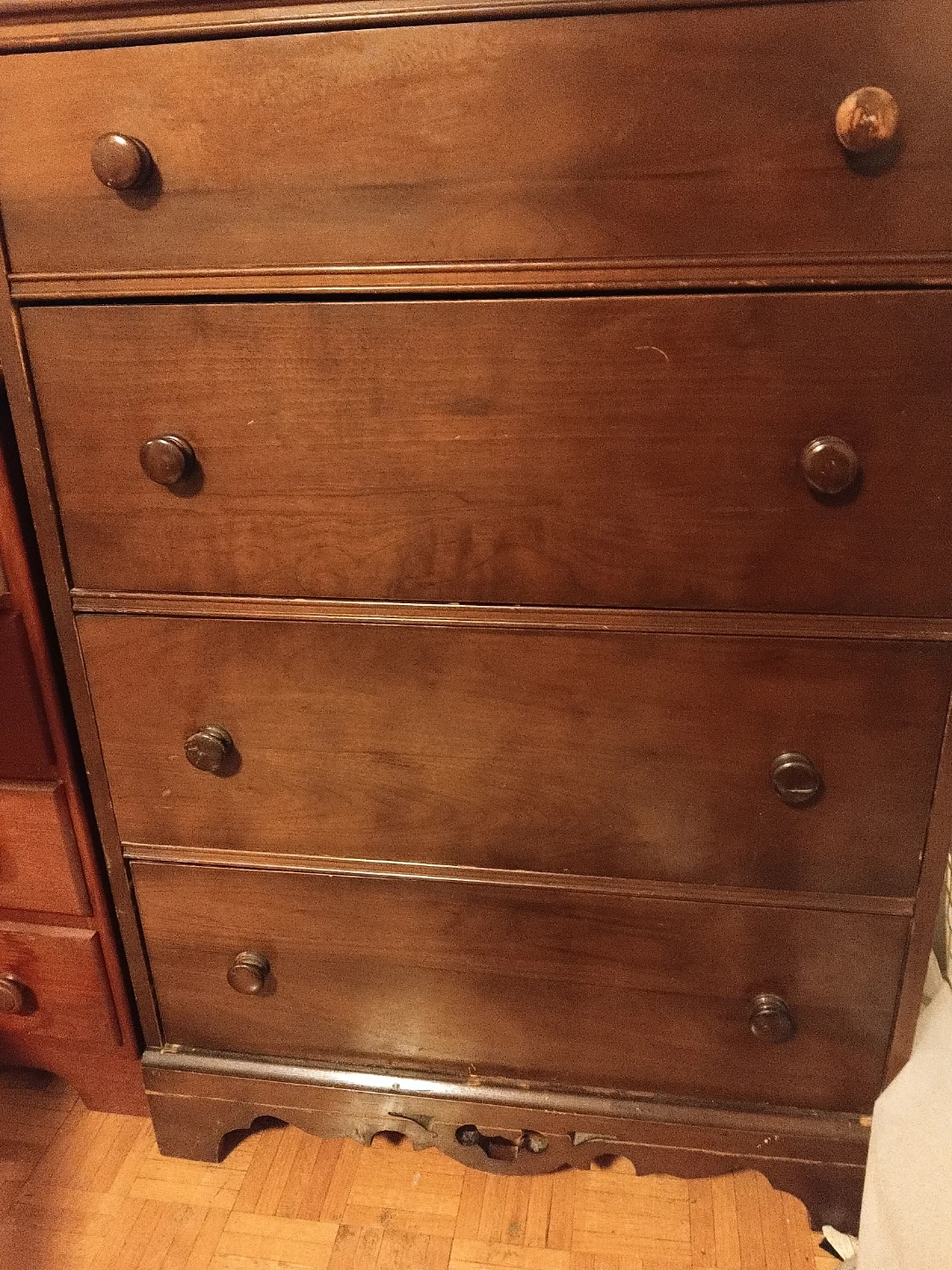 Here's a lovely wooden dresser with five drawers! It's a classic piece that would look great in any bedroom. It shows some signs of use, but it's still sturdy and functional.
