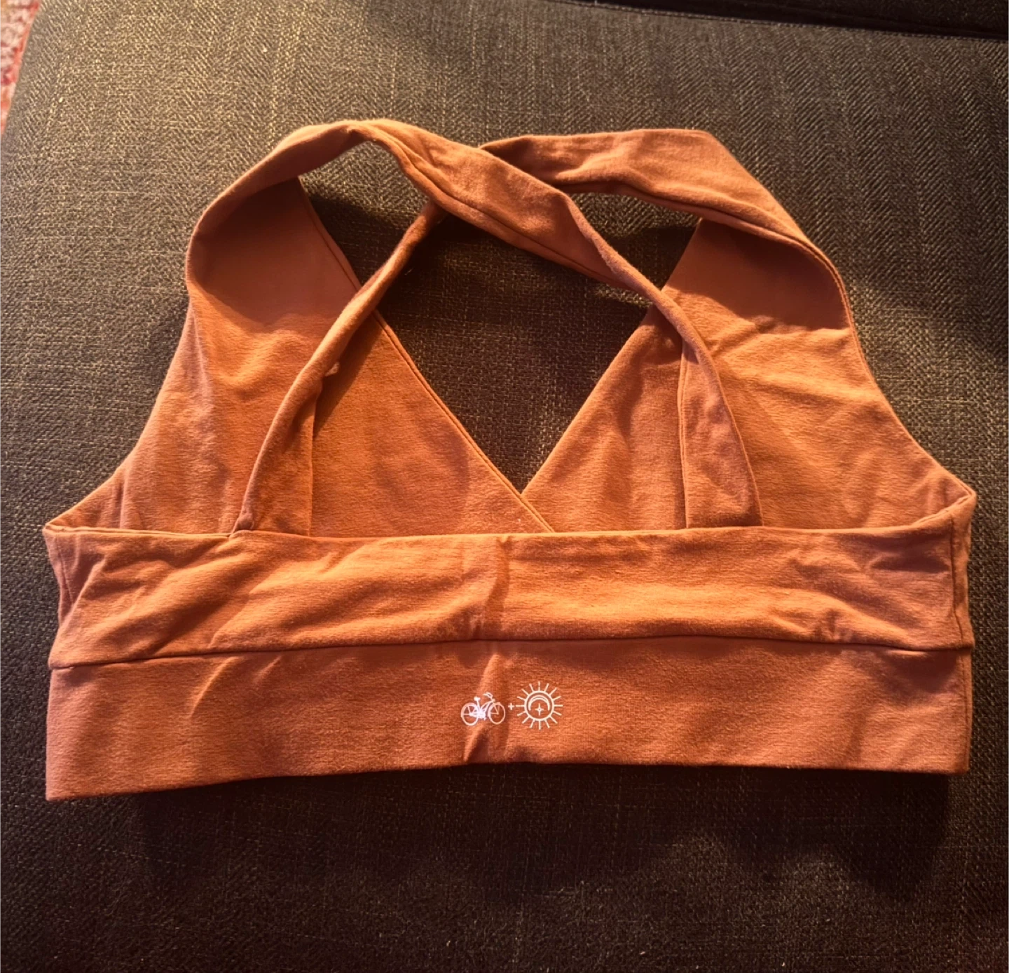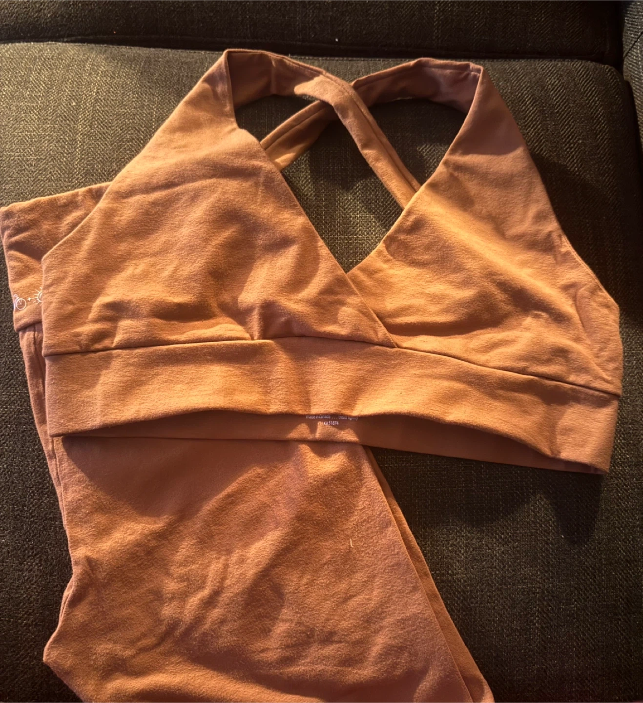 Size Medium, Sienna colour. This set is perfect for workouts or just lounging around. The material feels super soft on your skin. It's in great condition and ready for a new home!