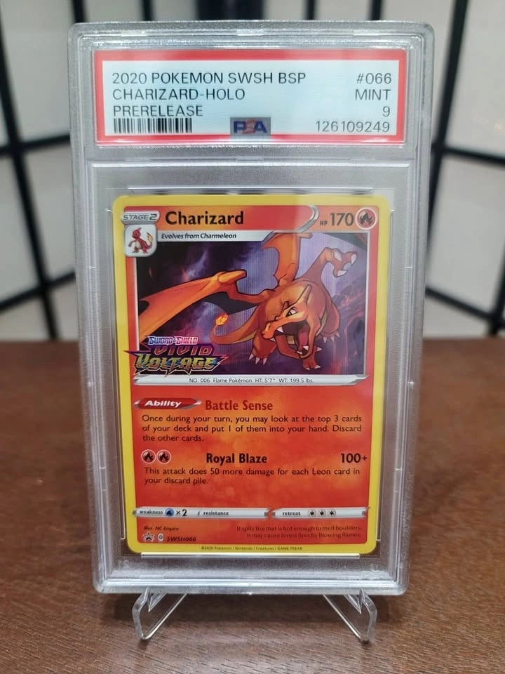 Up for sale is an authentic PSA-graded Charizard prerelease promo from the 2020 Sword & Shield era — a popular modern Charizard with strong collector appeal.