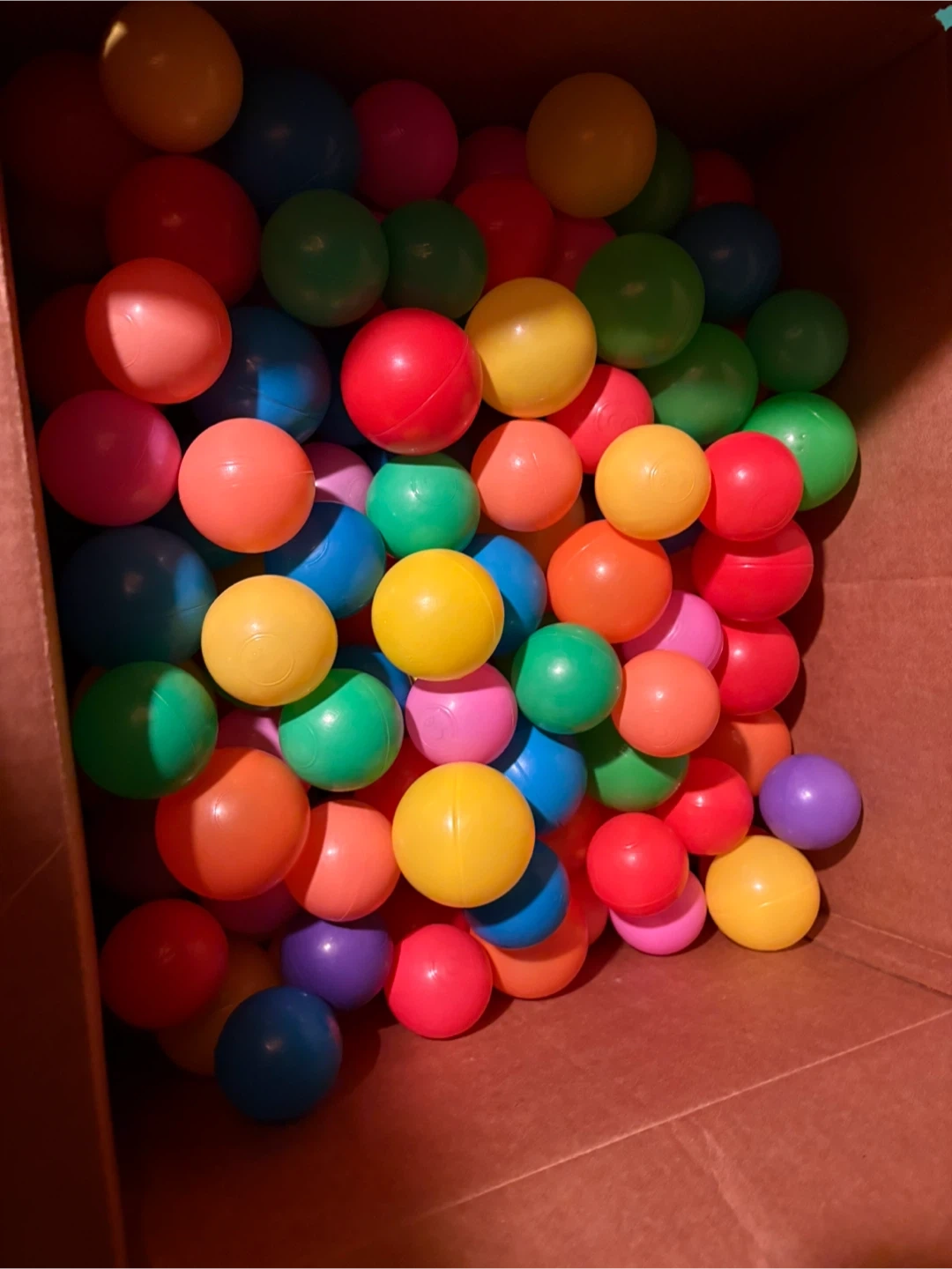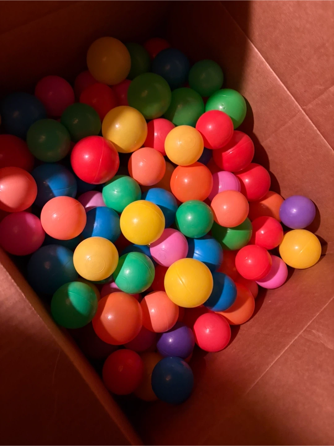 Selling a box of colourful plastic ball pit balls! These are perfect for a ball pit, play area, or just for fun. There's a variety of colours included in the box.