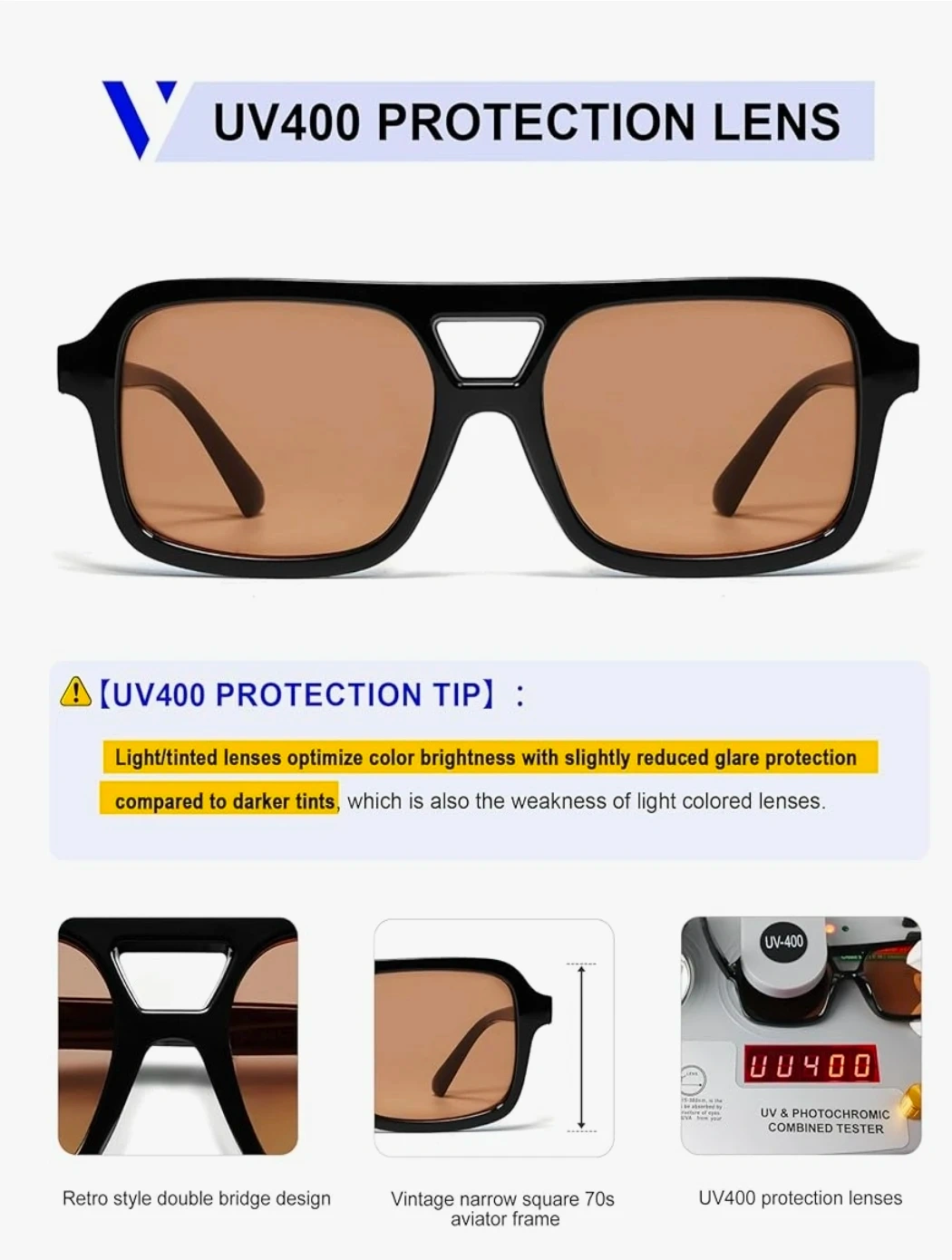 These VANLINKER sunglasses feature a retro-style double bridge design and narrow square 70s aviator frame. The lenses offer UV400 protection. They are suitable for medium to wide faces. Comes with the soft pouch and a cleaning cloth!