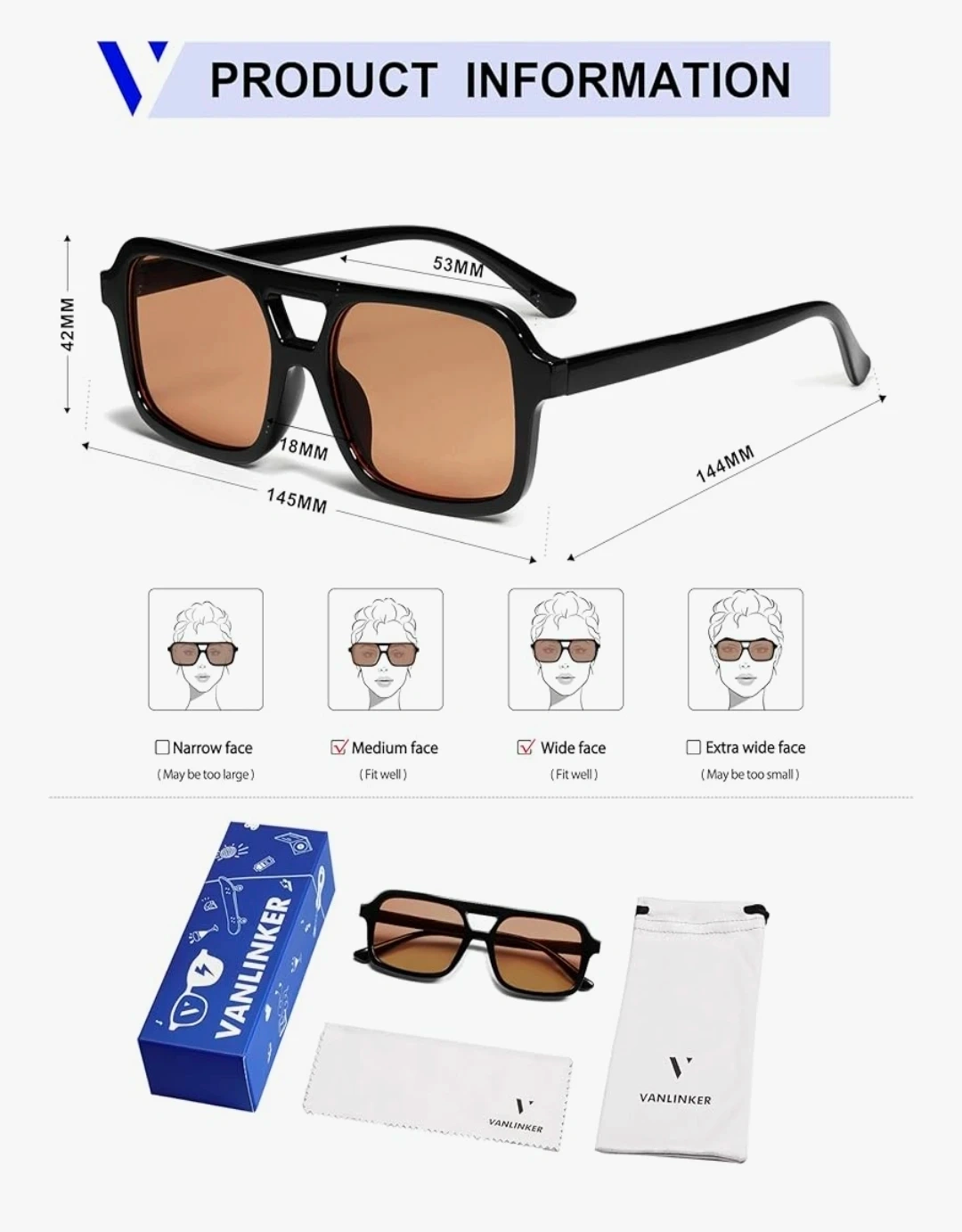 These VANLINKER sunglasses feature a retro-style double bridge design and narrow square 70s aviator frame. The lenses offer UV400 protection. They are suitable for medium to wide faces. Comes with the soft pouch and a cleaning cloth!