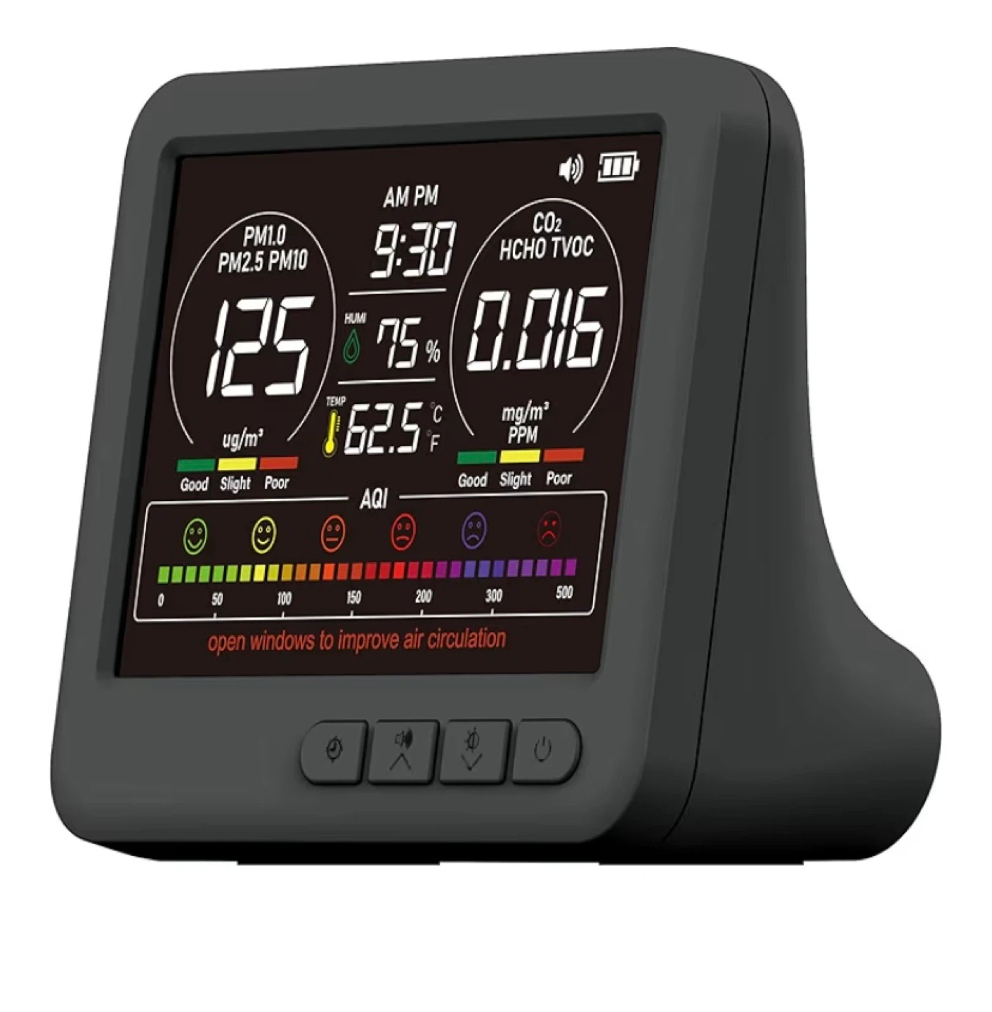 Selling an air quality monitor. It displays PM1.0, PM2.5, PM10 levels, as well as HCHO and TVOC. It also shows the temperature and humidity. The display indicates the air quality with a smiley face scale.