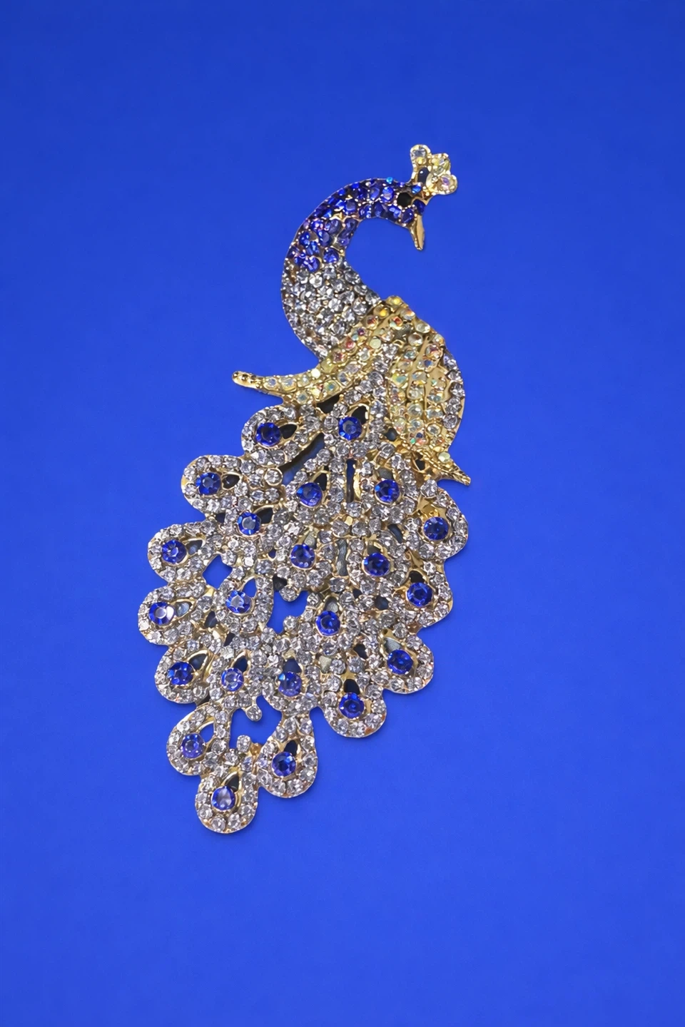 Beautiful peacock brooch with blue and gold detailing! This eye-catching piece is in excellent condition and comes in a box. Perfect for adding a touch of elegance to any outfit or collection