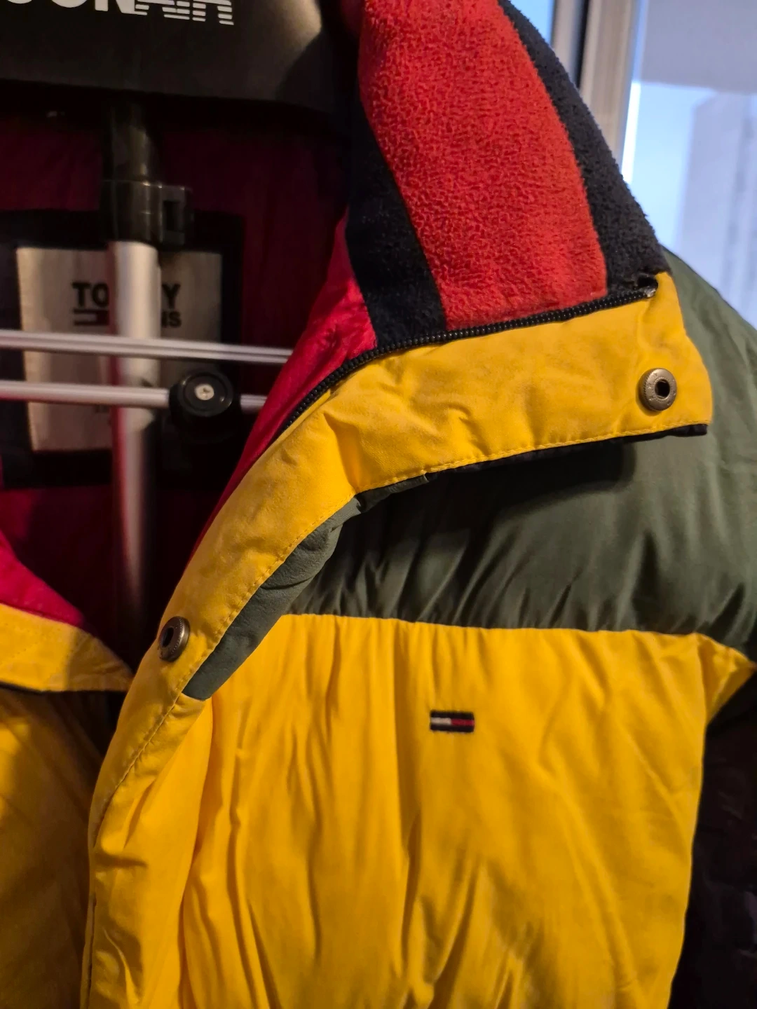 Selling a Vintage Tommy Jeans puffer jacket in a cool colour block design. It's a size medium and features a mix of red, yellow, green, and blue. Perfect for staying warm and stylish this winter