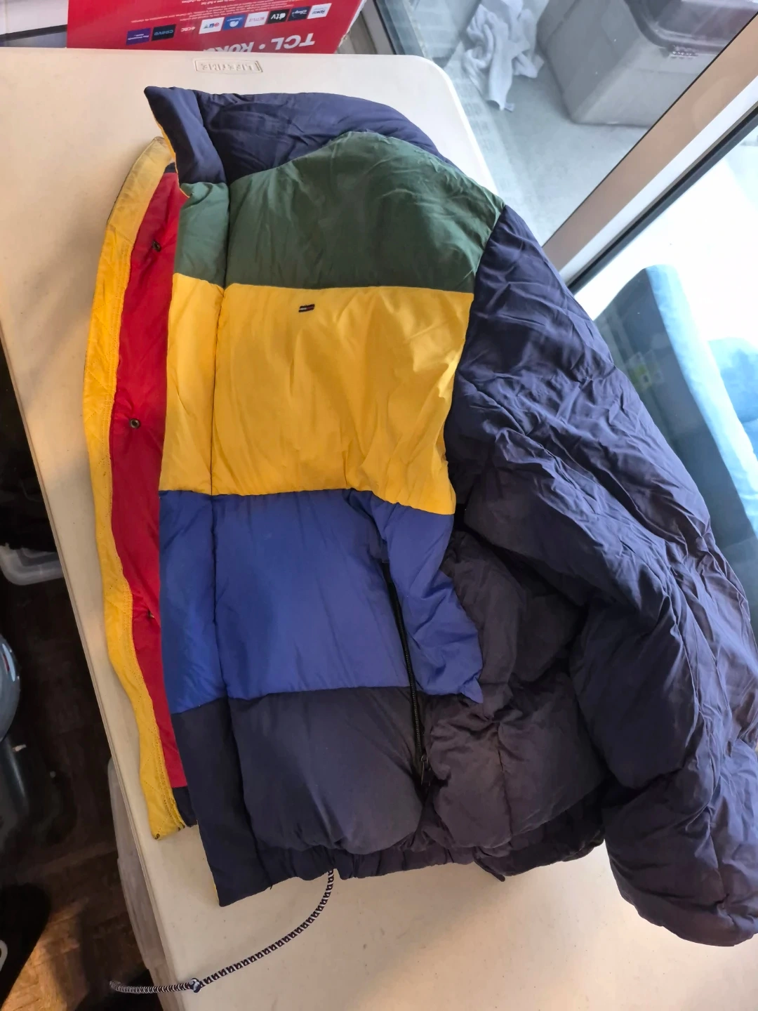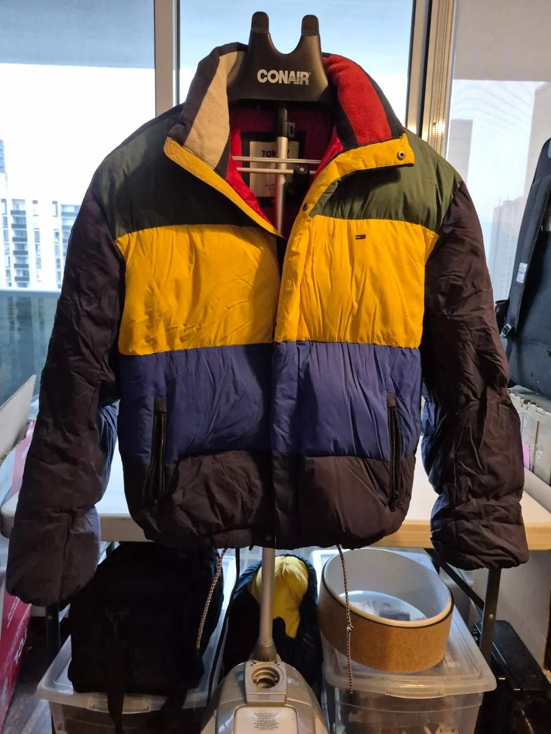 Selling a Vintage Tommy Jeans puffer jacket in a cool colour block design. It's a size medium and features a mix of red, yellow, green, and blue. Perfect for staying warm and stylish this winter