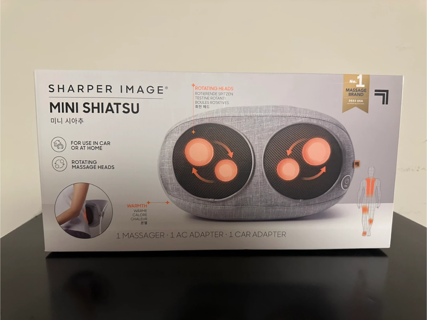 Selling a brand new Sharper Image Mini Shiatsu massager, still in its original box! It's designed for use in the car or at home and features rotating massage heads for deep shiatsu kneading. The box includes the massager, AC adapter, and car adapter