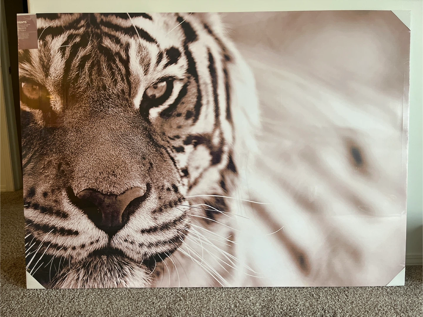 Selling a canvas print featuring a tiger. It measures 140x100cm, which is about 55.1" x 39.4". The material is polyester and pine wood