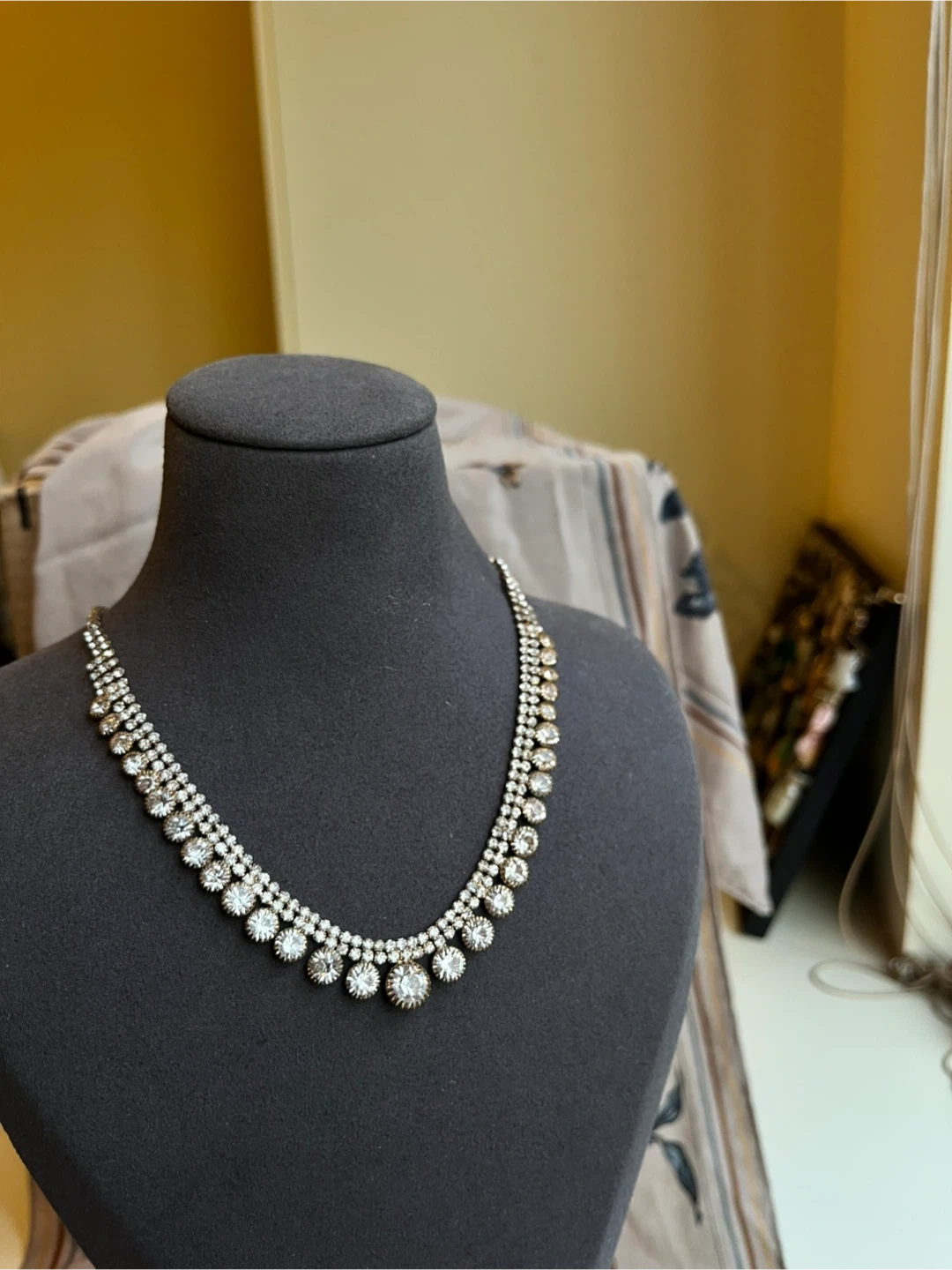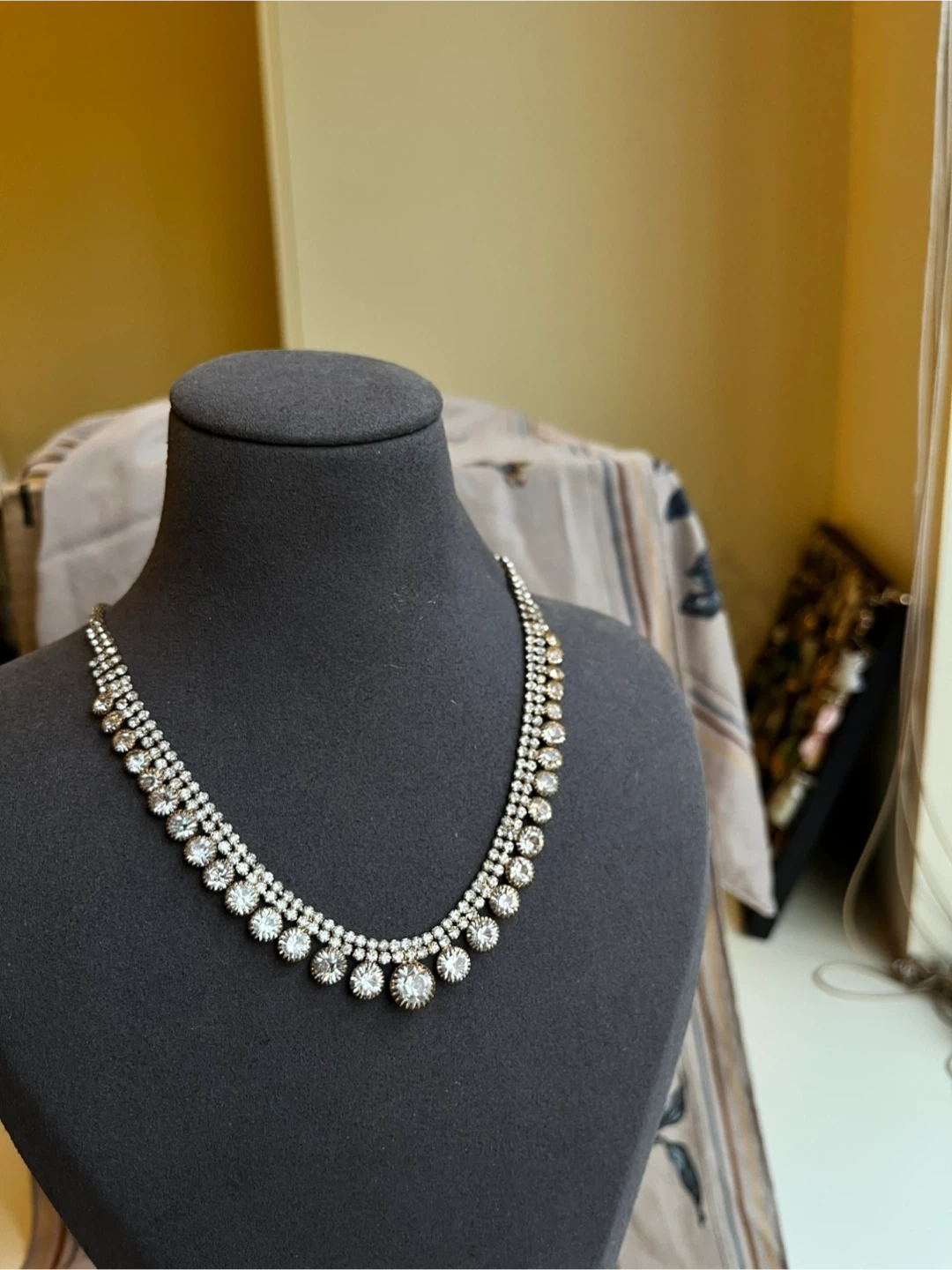 Here's a beautiful rhinestone statement necklace! It's perfect for adding a touch of sparkle to any outfit. The necklace features multiple rows of sparkling rhinestones, creating a glamorous and eye-catching look
