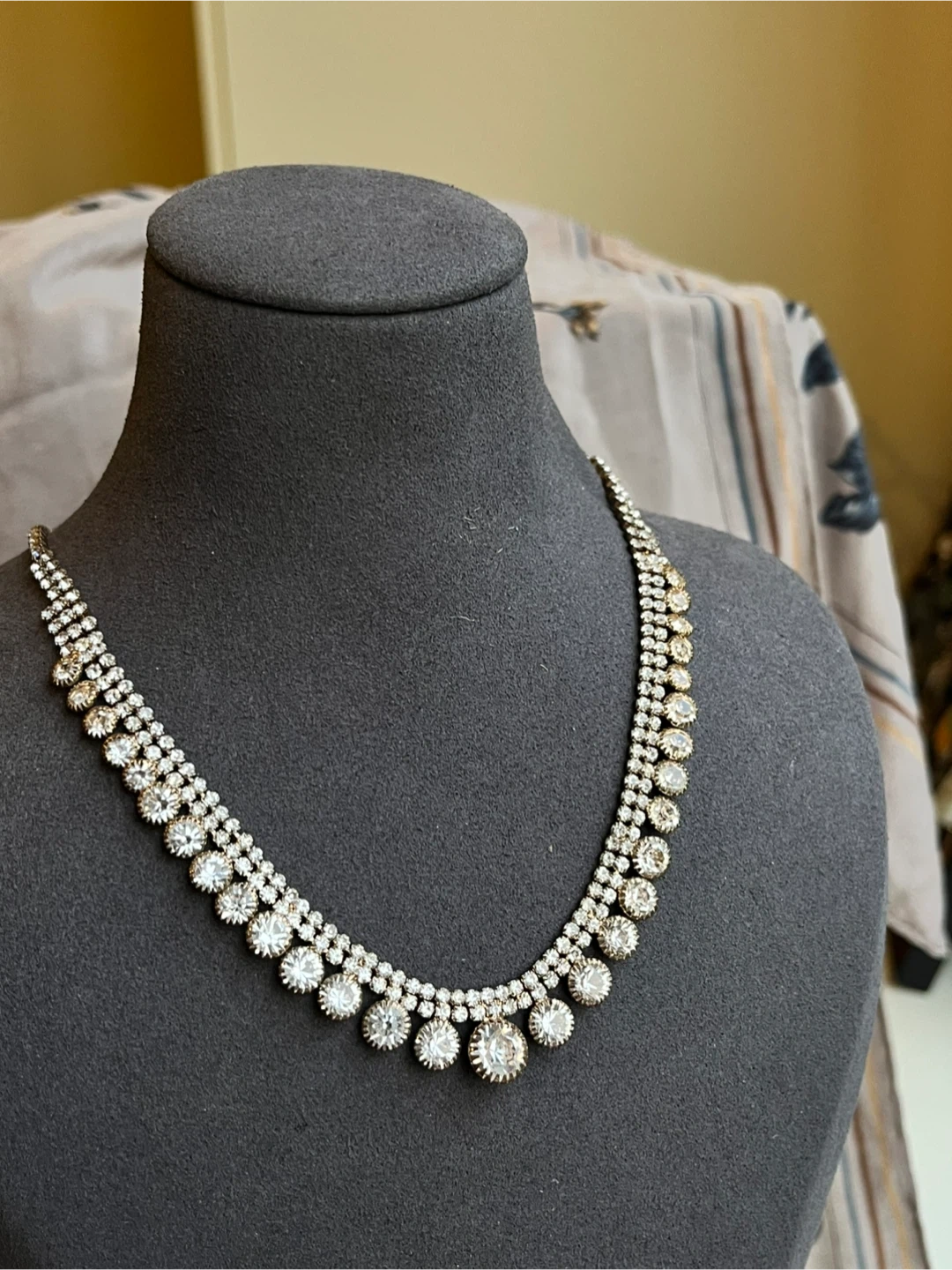 Here's a beautiful rhinestone statement necklace! It's perfect for adding a touch of sparkle to any outfit. The necklace features multiple rows of sparkling rhinestones, creating a glamorous and eye-catching look
