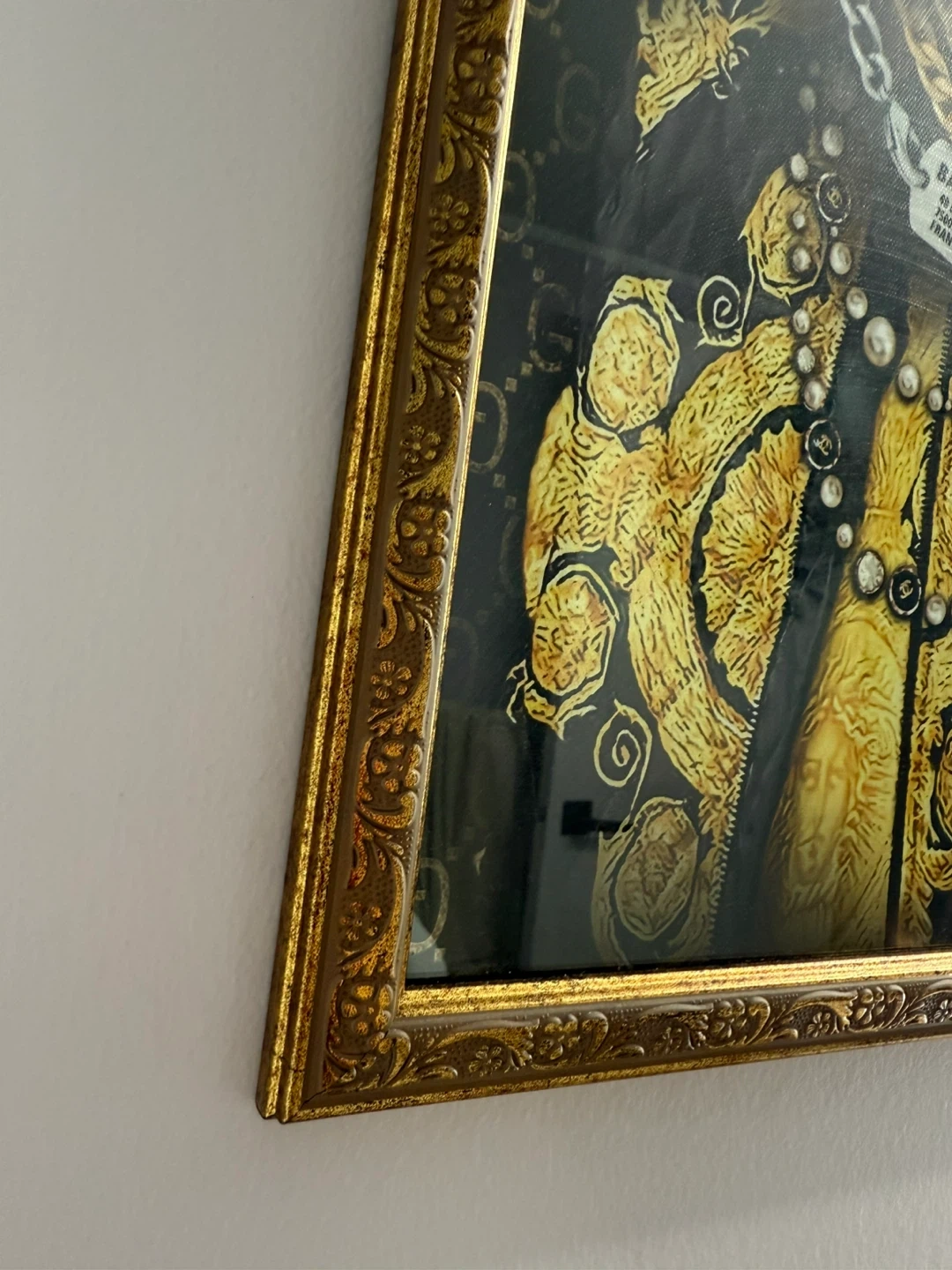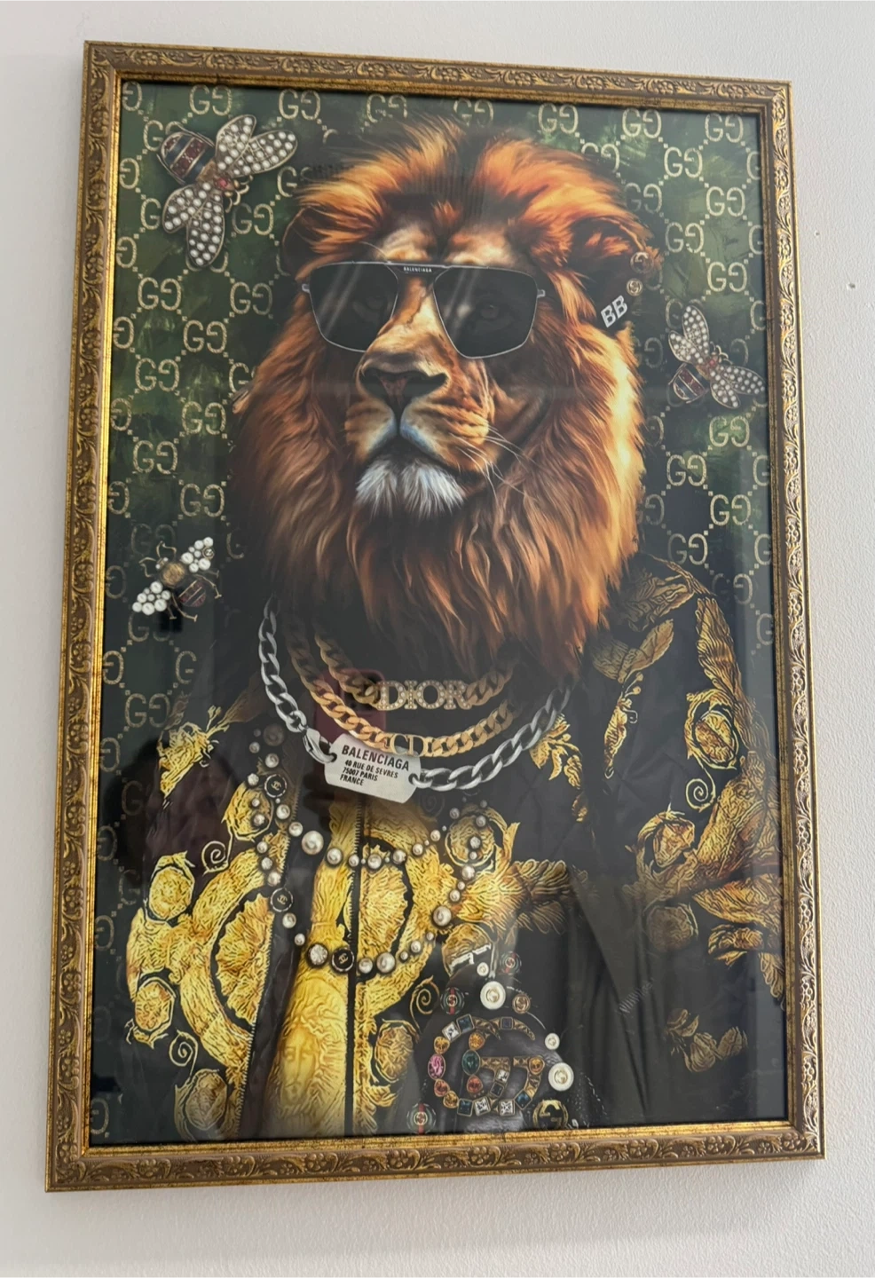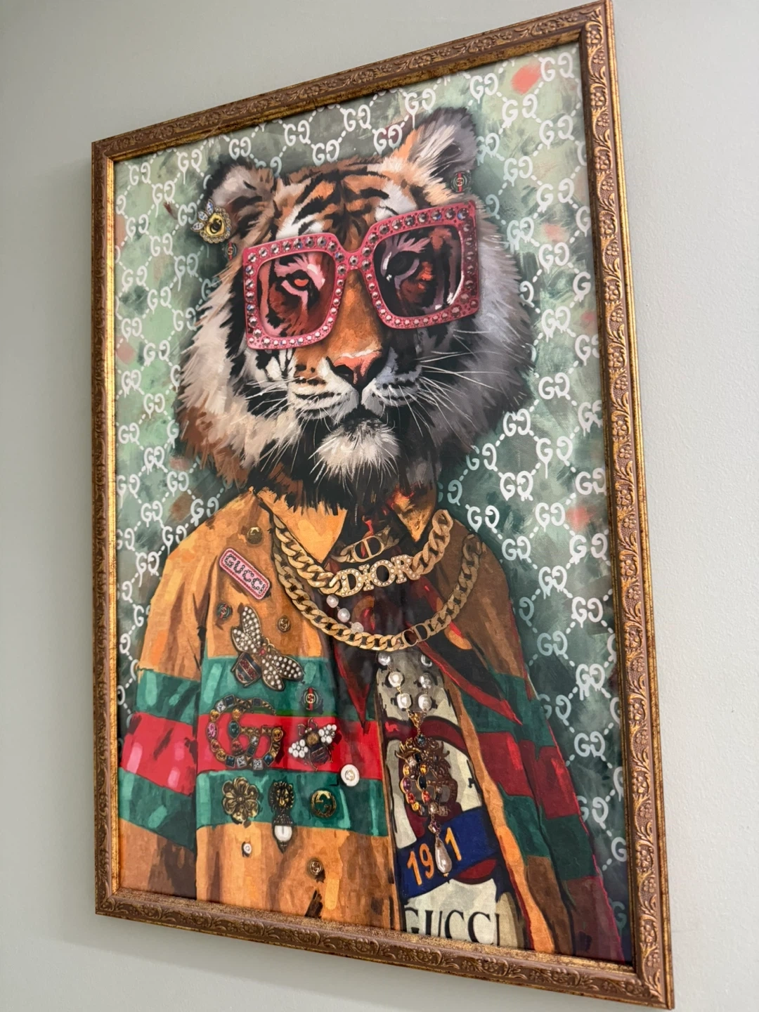 This framed art features a tiger decked out in Gucci-inspired accessories. It measures approximately 16 inches wide and 26 inches tall. A fun piece to add some personality to your space