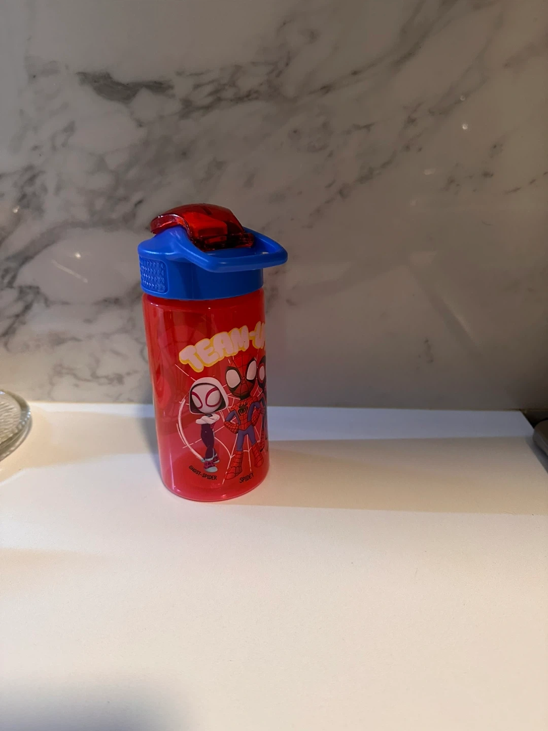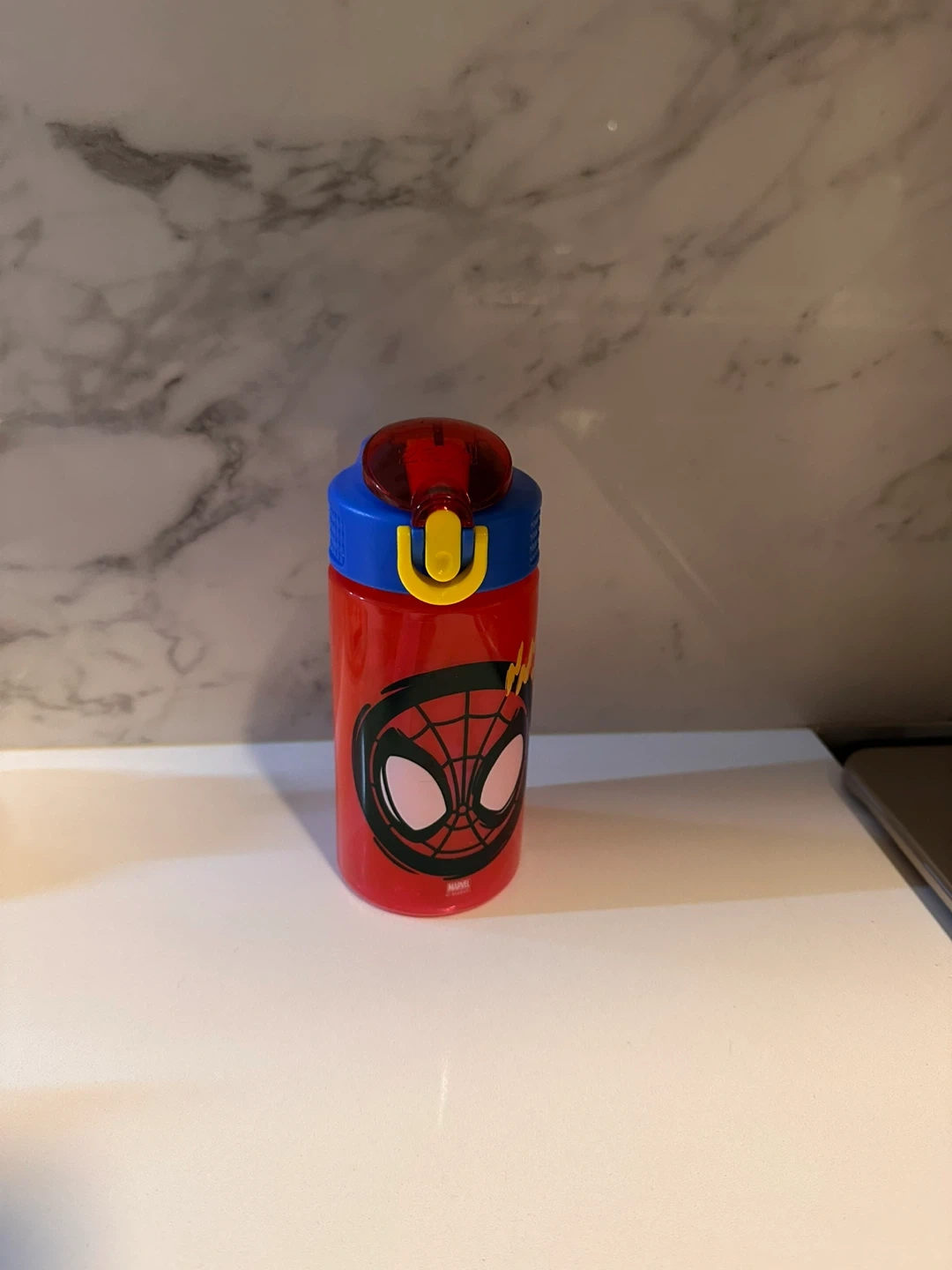 Selling a Marvel Spiderman water bottle. It's red and blue and holds 16 oz / 473 ml. Great for kids!