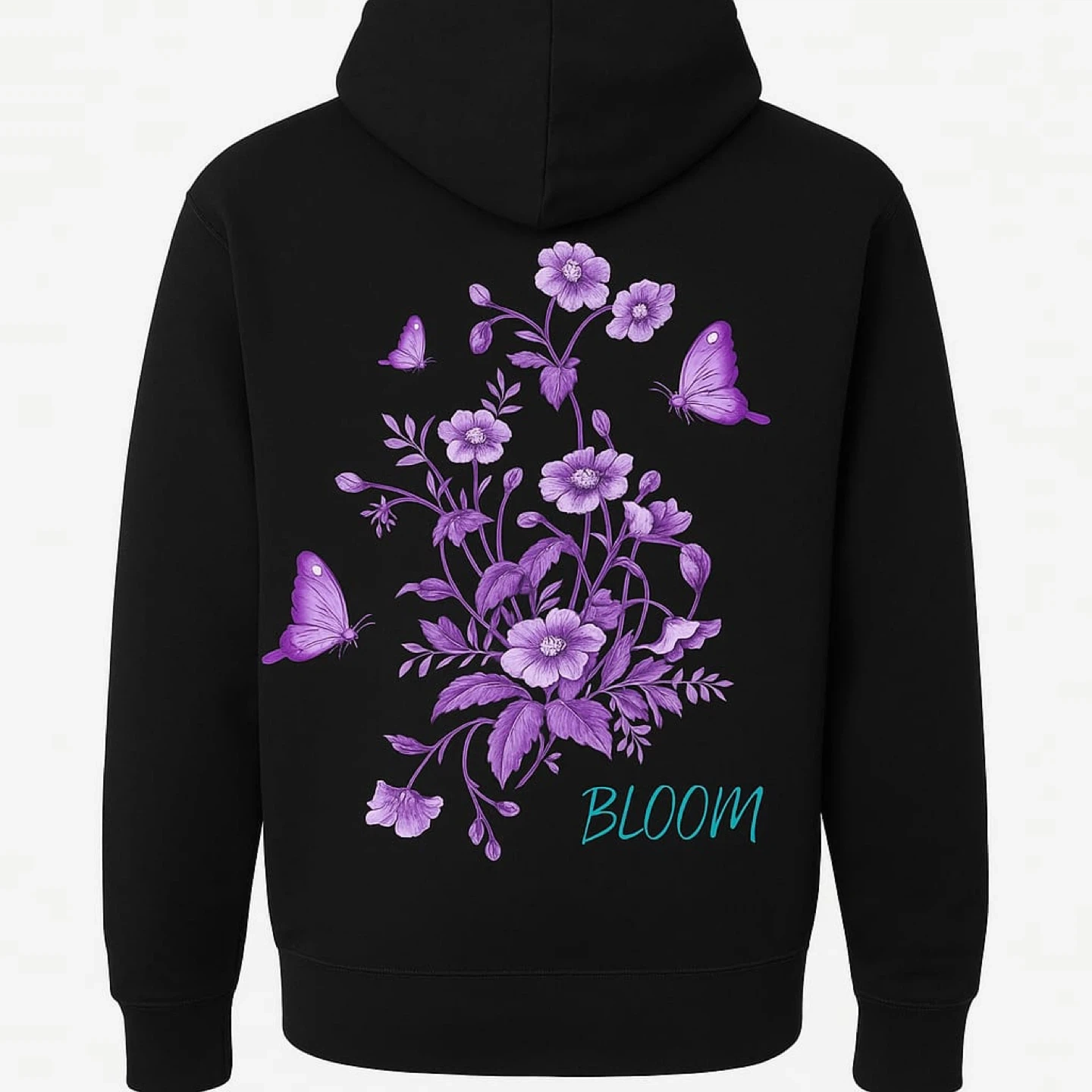 Cozy hoodie with a lovely bloom print on the back! Comes in black, white, grey, dark blue, and black. Perfect for adding a touch of nature to your wardrobe