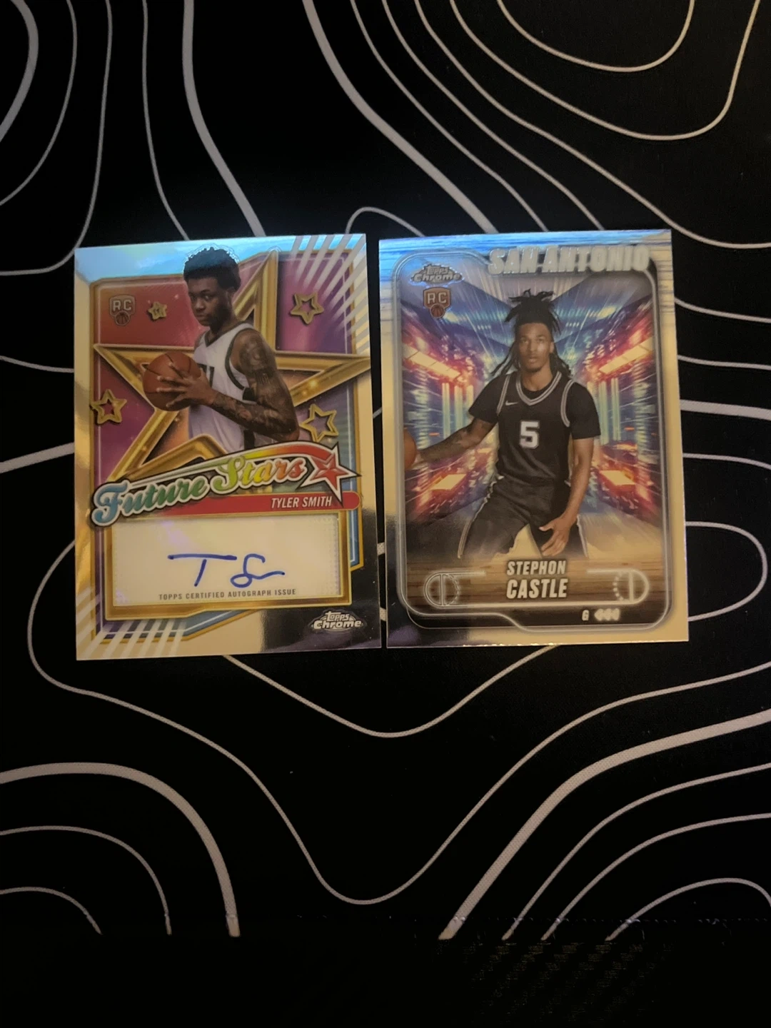 Selling two Topps Chrome basketball cards featuring Tyler Smith and Stephon Castle! The Tyler Smith card is a Future Stars autograph card from the 2024-25 Topps Chrome Basketball series. Both cards are in great condition and would be a great addition to any collection