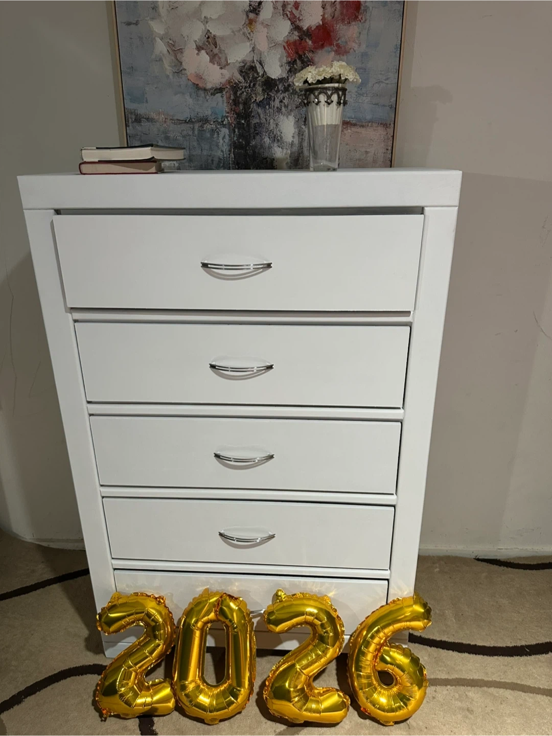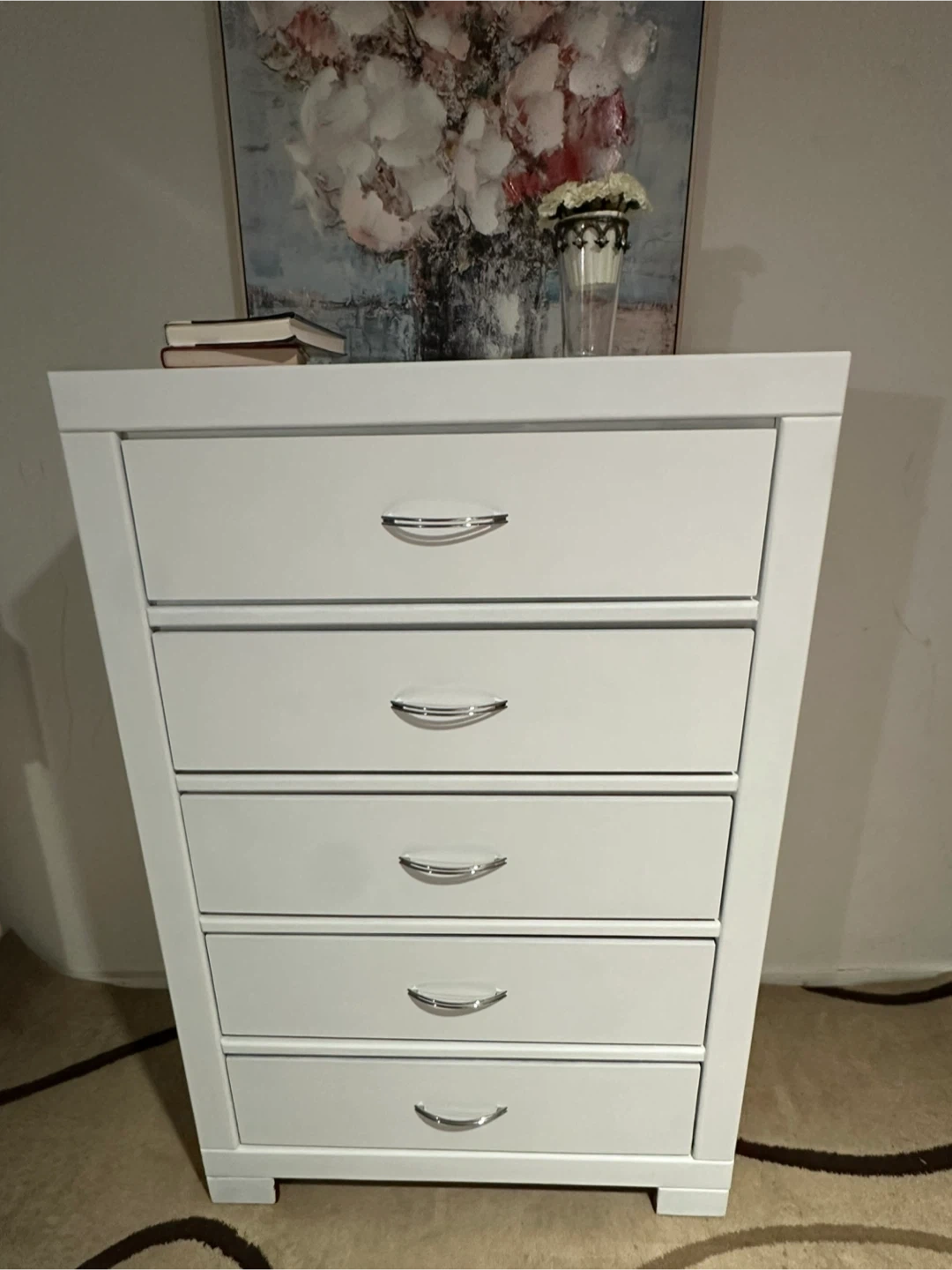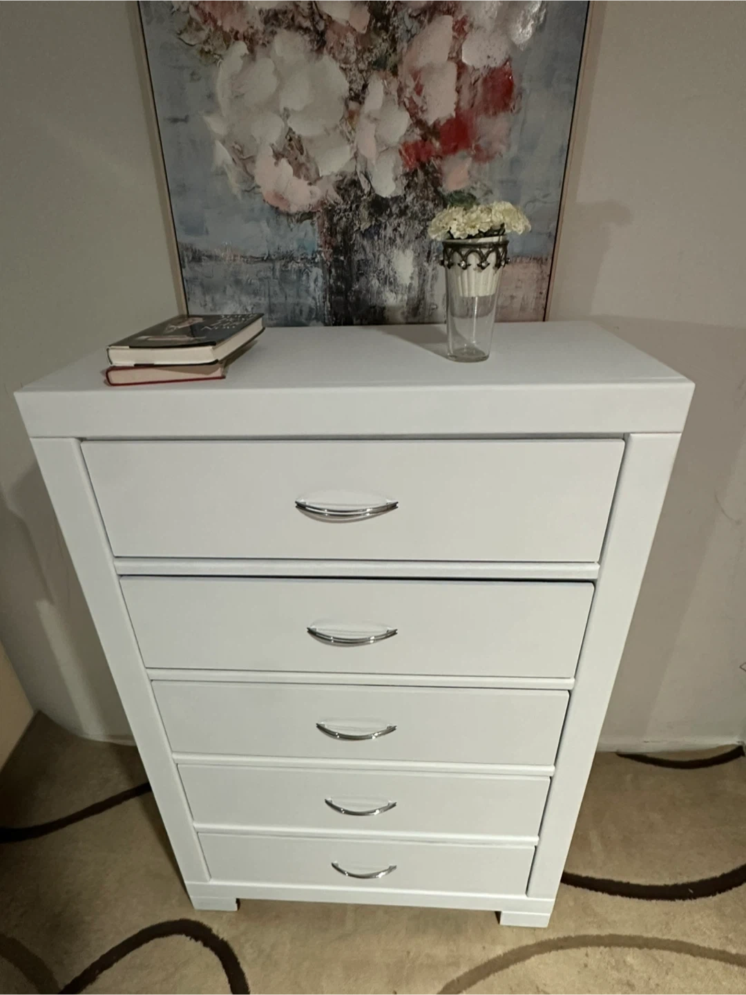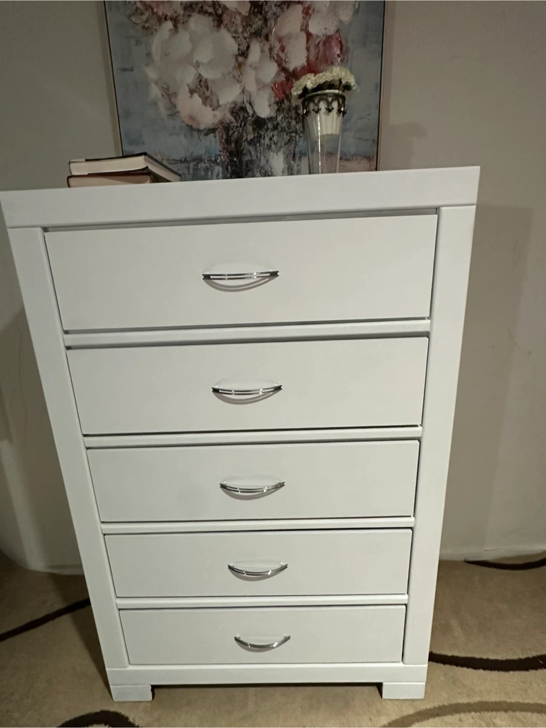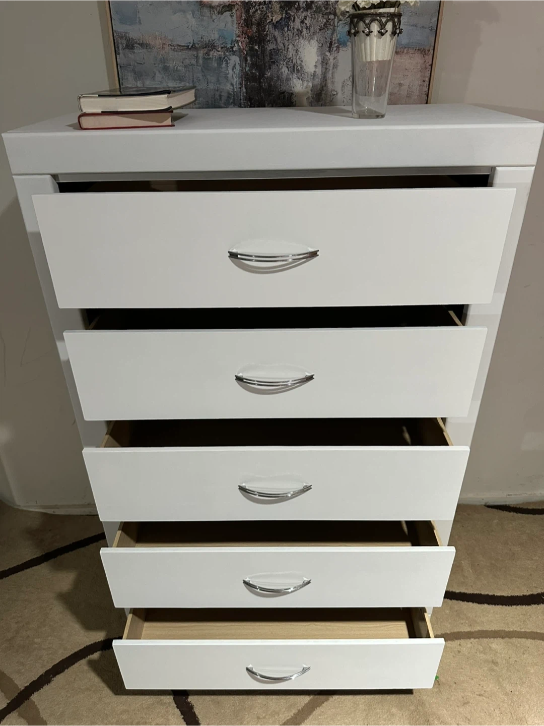 Selling a white chest with five drawers. It's in great shape and ready to organize your space! The drawers slide smoothly, and it offers ample storage.