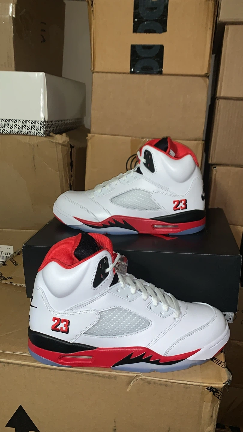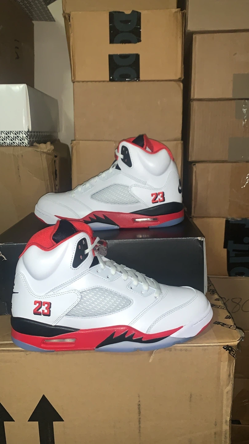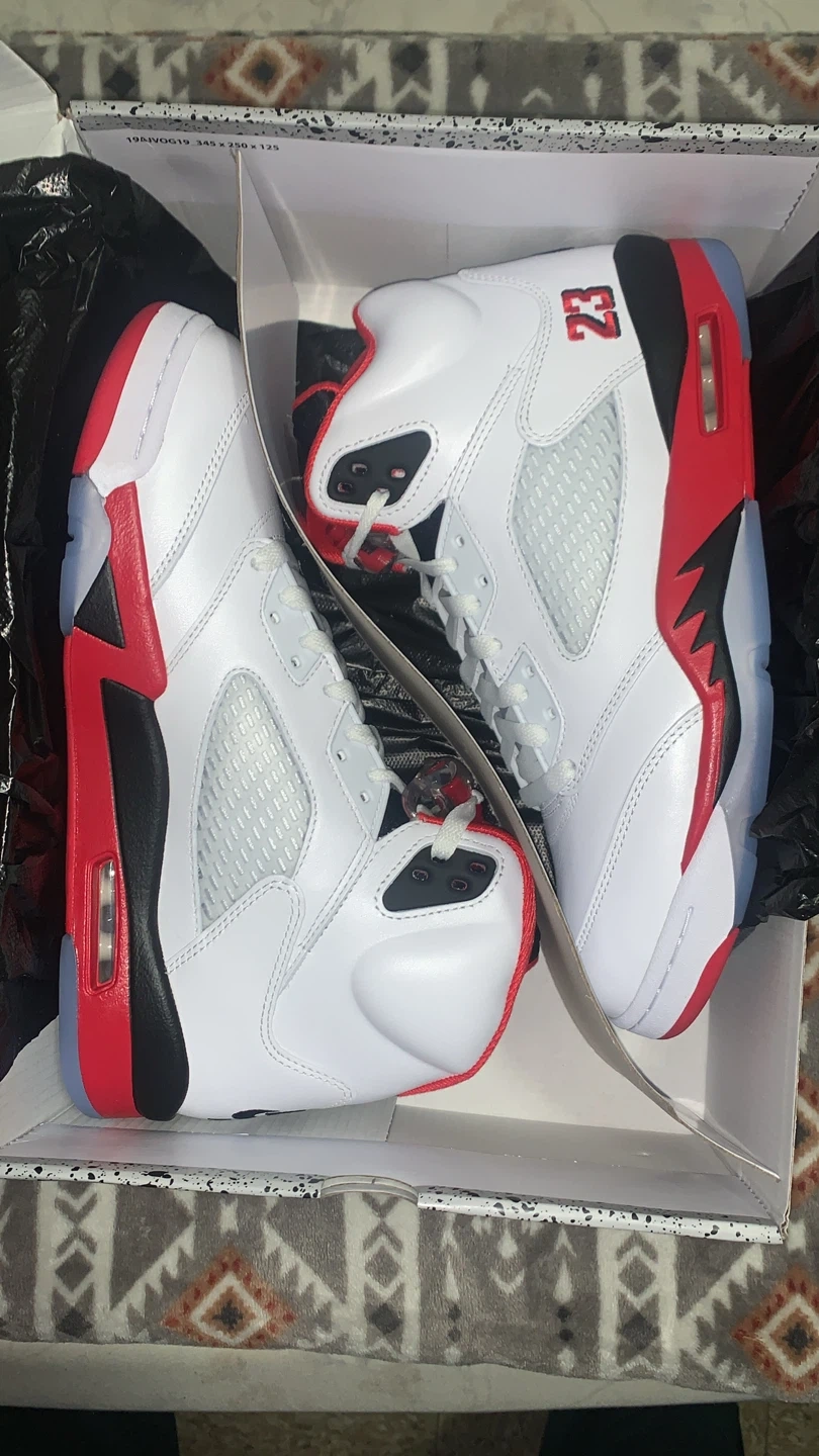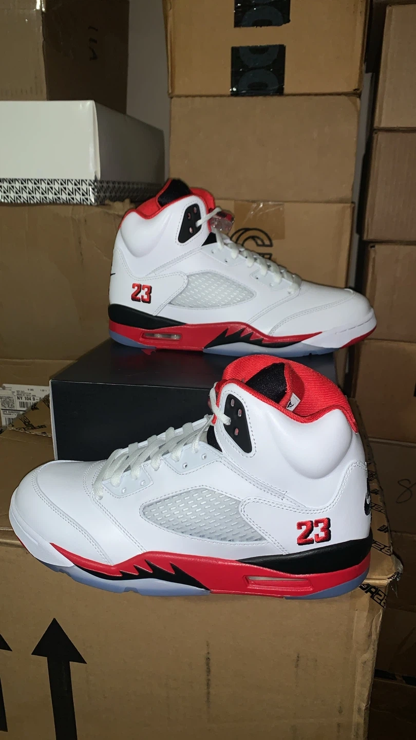 Selling a pair of Nike Air Jordan 5 Retro in the Fire Red colorway! They are in great condition and come with the original box. The shoes feature the number 23 on the side and the Nike Air logo on the back. They are a stylish and iconic addition to any sneaker collection
