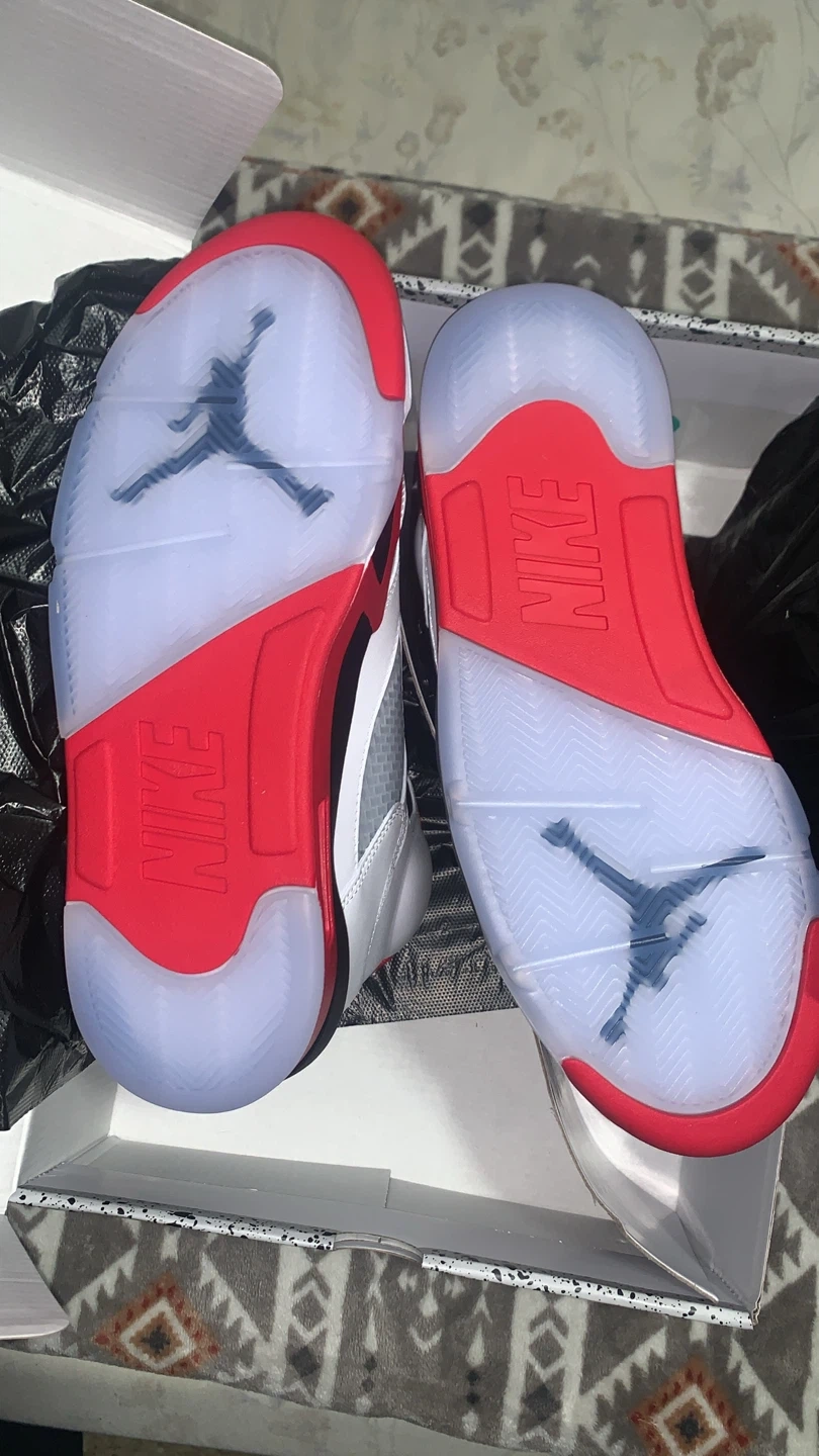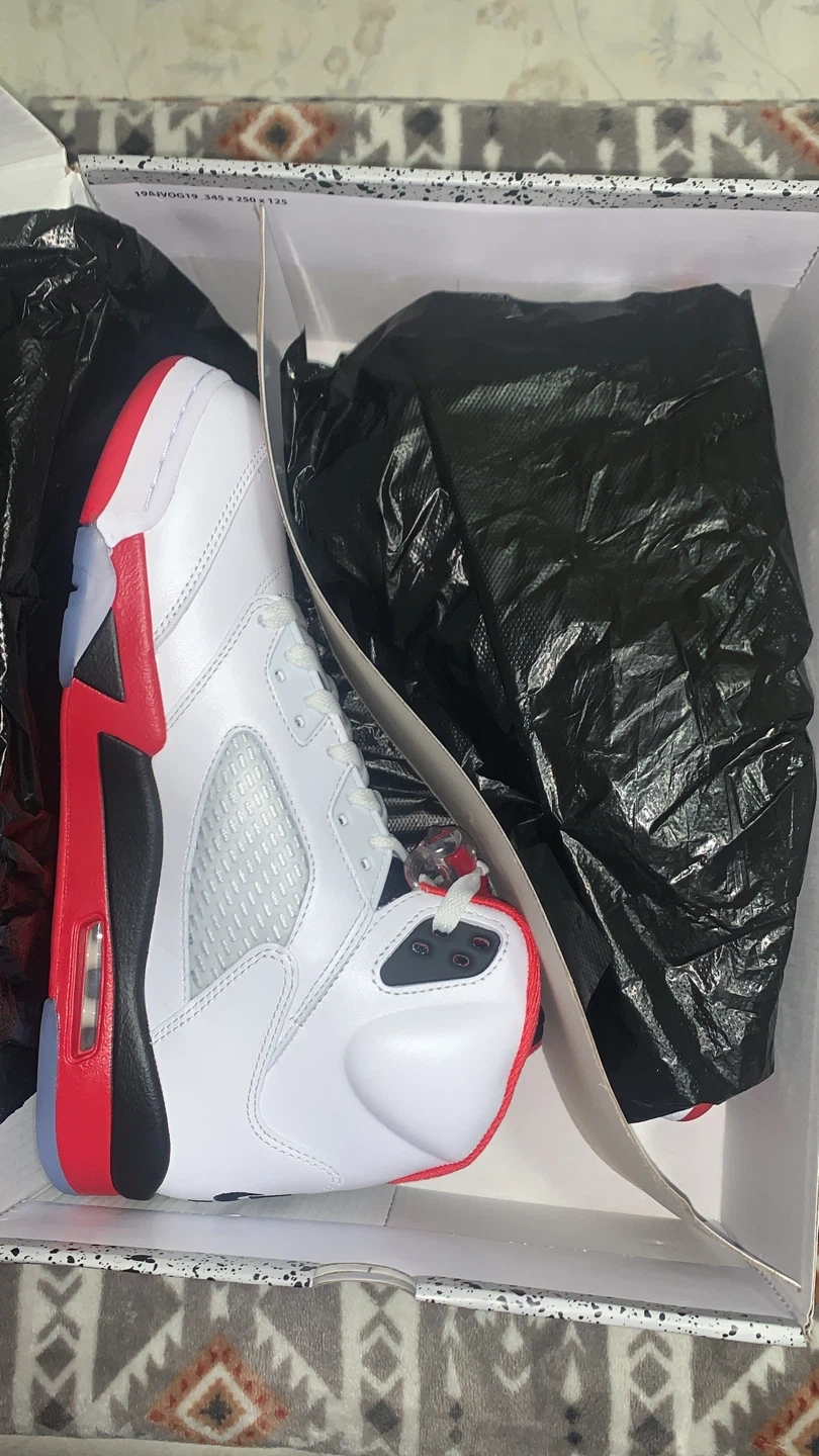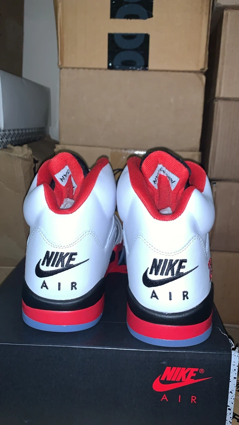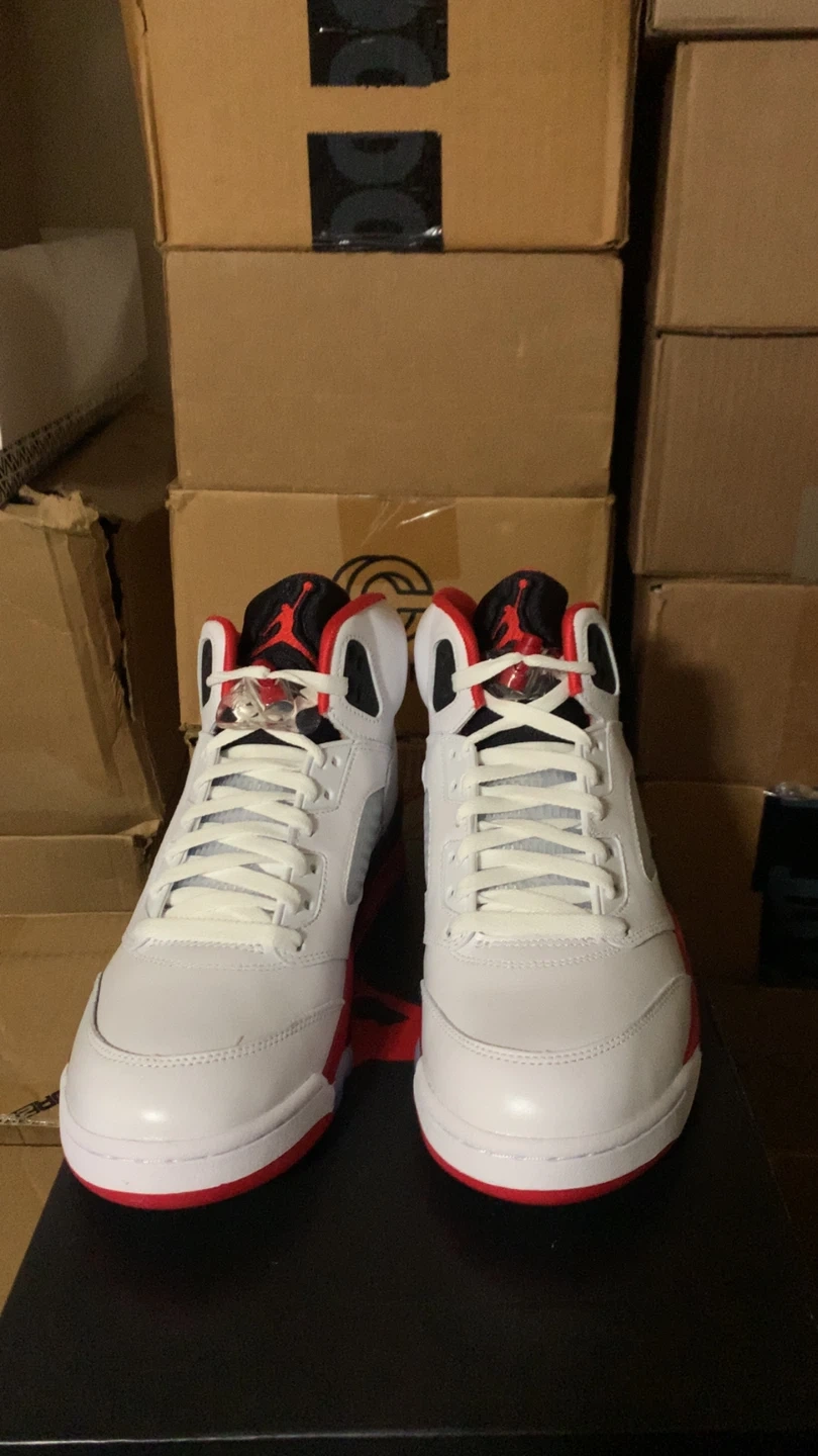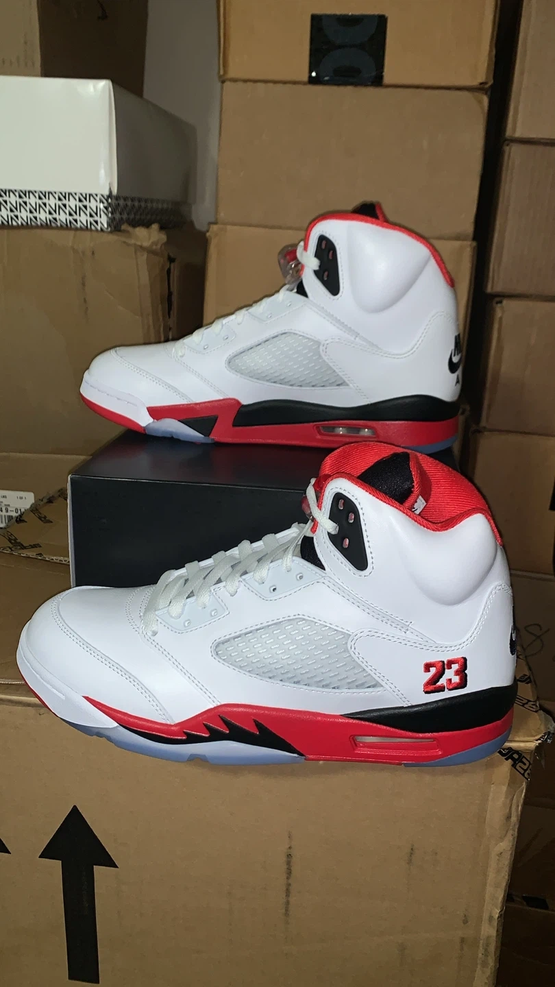 Selling a pair of Nike Air Jordan 5 Retro in the Fire Red colorway! They are in great condition and come with the original box. The shoes feature the number 23 on the side and the Nike Air logo on the back. They are a stylish and iconic addition to any sneaker collection