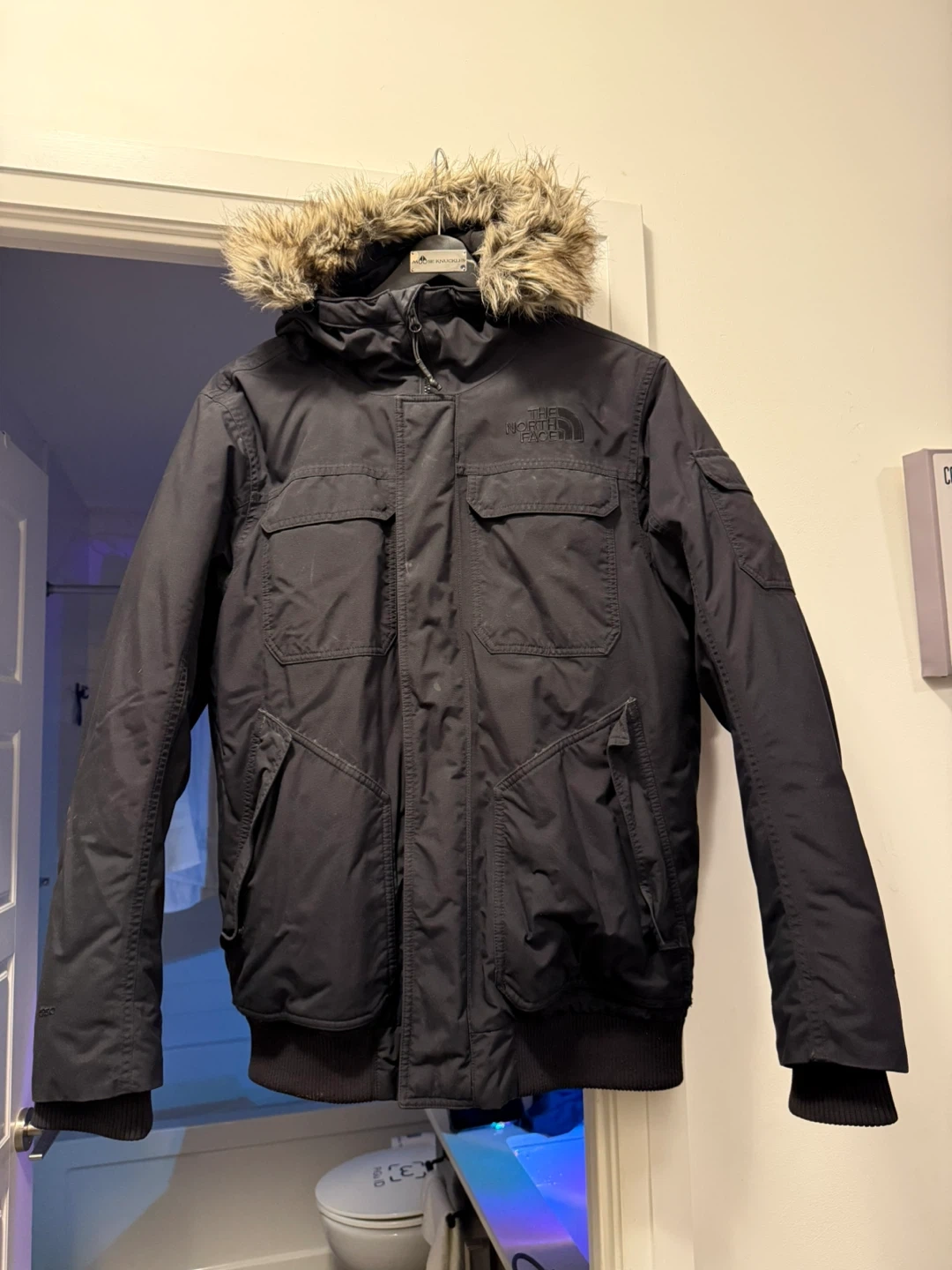 The North Face men's jacket in size Medium. It's in great condition and perfect for staying warm this winter. The jacket features a fur-trimmed hood and multiple pockets. It's a stylish and functional choice for braving the cold Canadian weather!
