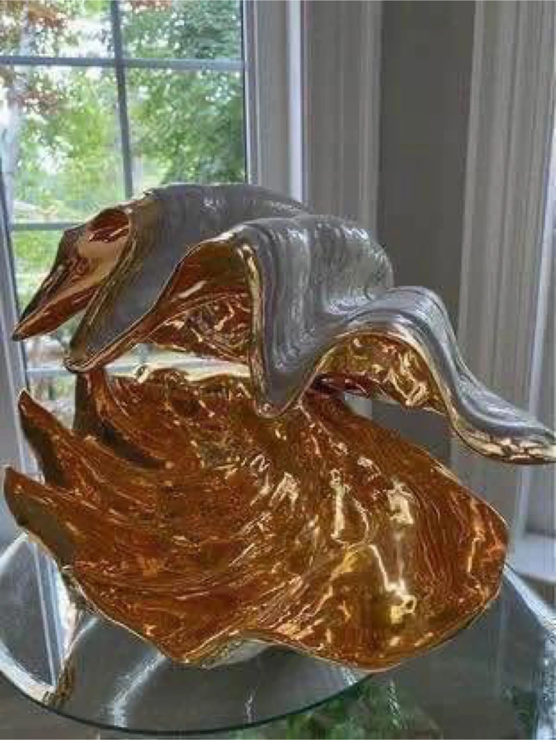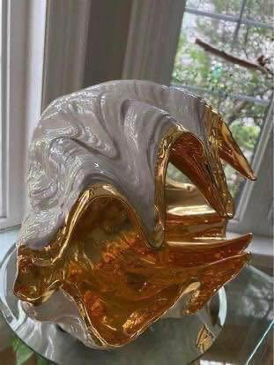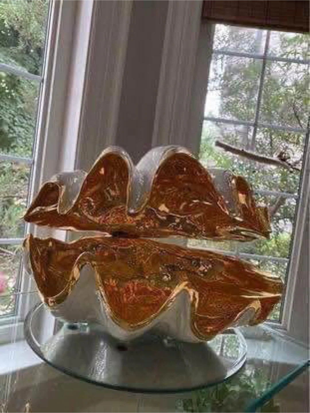 This is a beautiful decorative clam shell bowl, perfect for adding a touch of elegance to any room. It features a stunning gold and white finish.