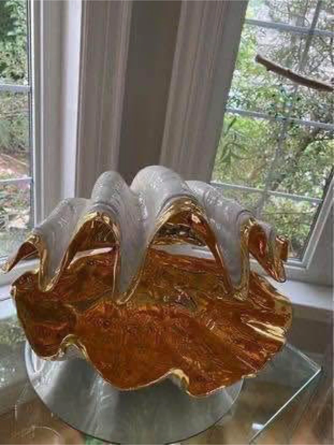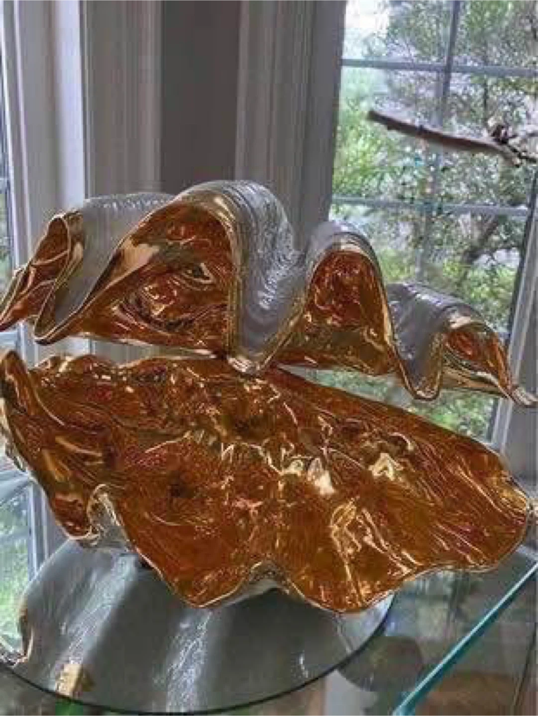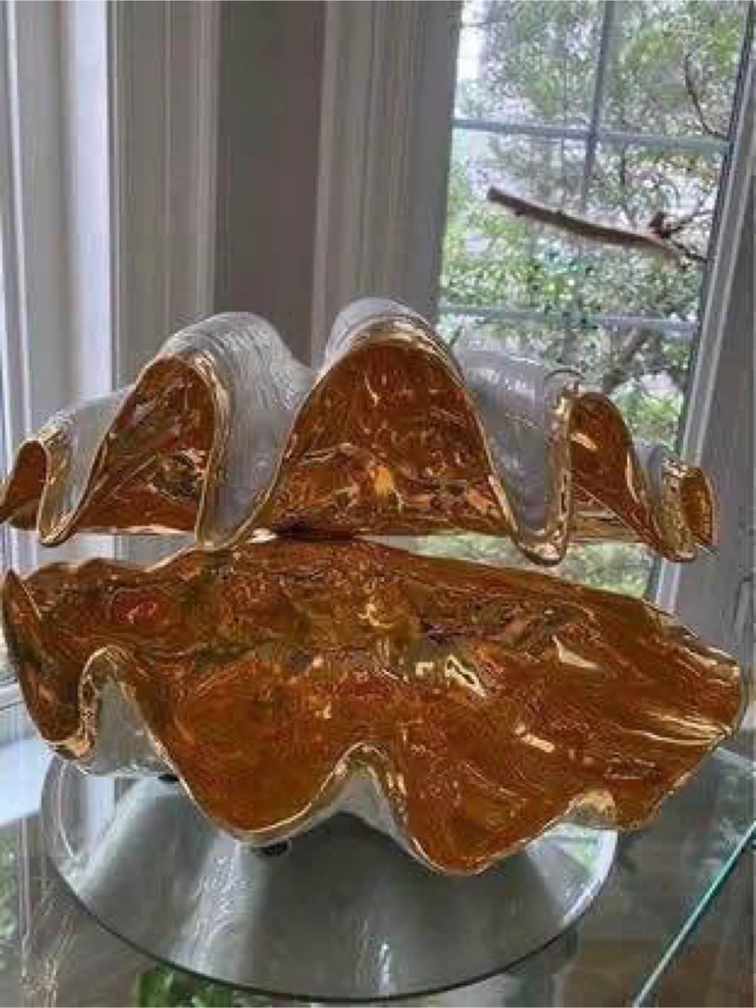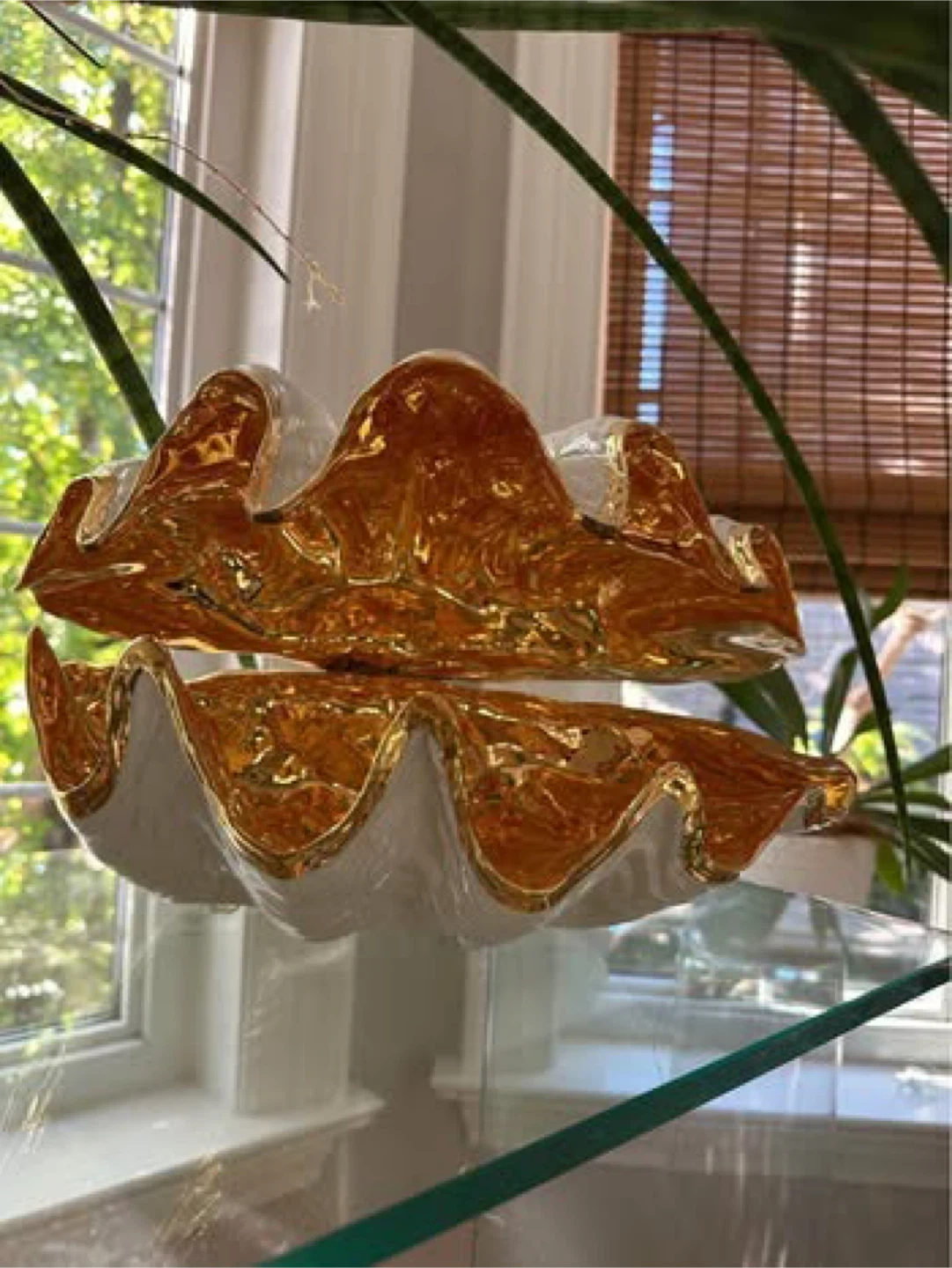 This is a beautiful decorative clam shell bowl, perfect for adding a touch of elegance to any room. It features a stunning gold and white finish.