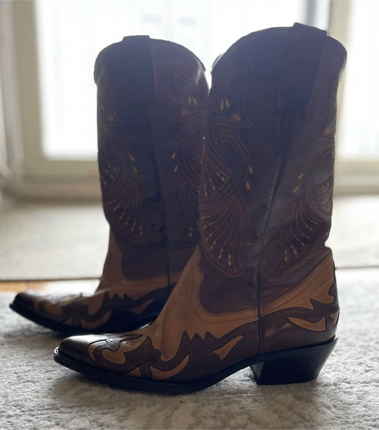 Selling a pair of stylish brown leather cowboy boots! They are a size 6 and feature a classic design with decorative stitching. Perfect for adding a touch of western flair to any outfit.