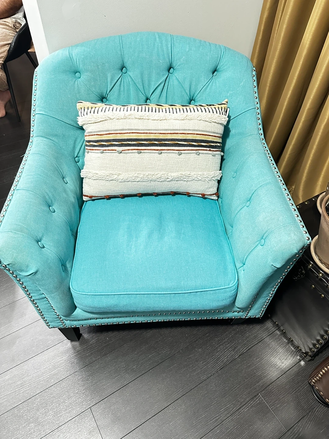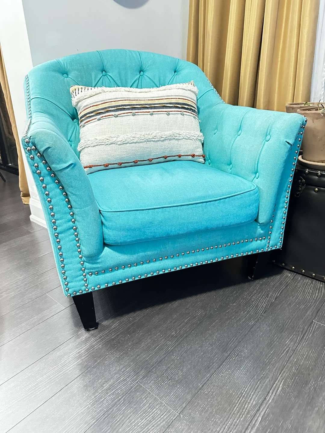 Turquoise accent chair in great condition! It's a stylish addition to any room. The chair features a comfortable seat.Great for adding a pop of colour to your living space( pillow not included)