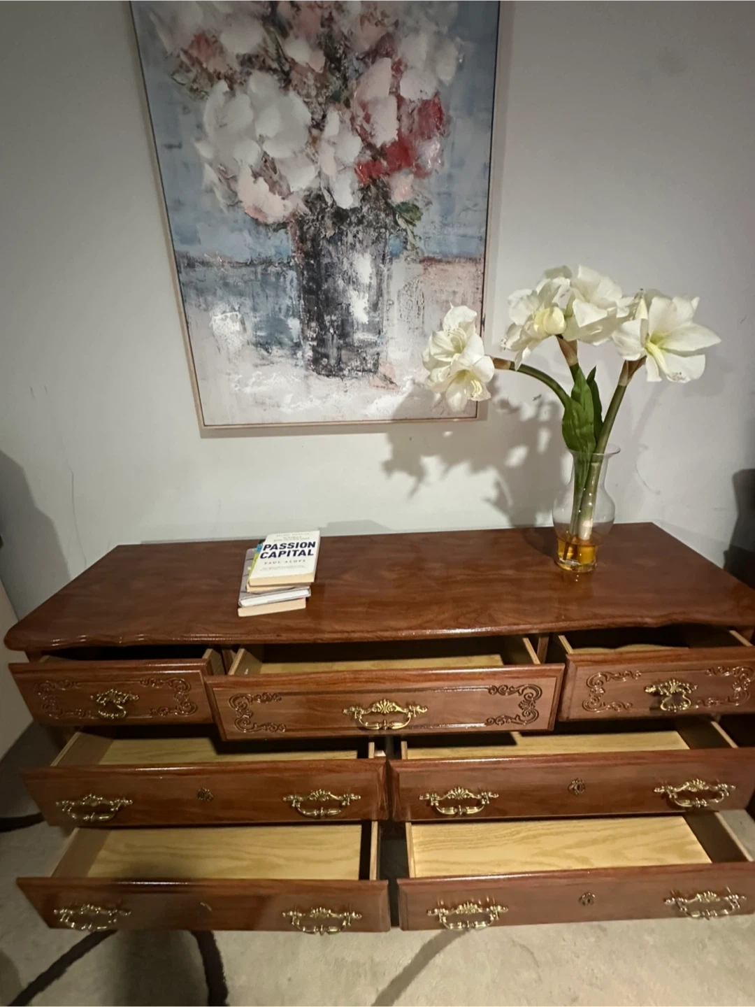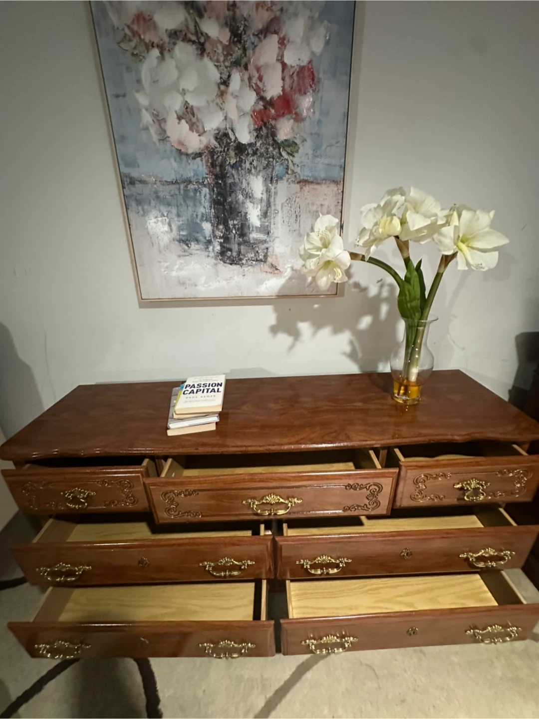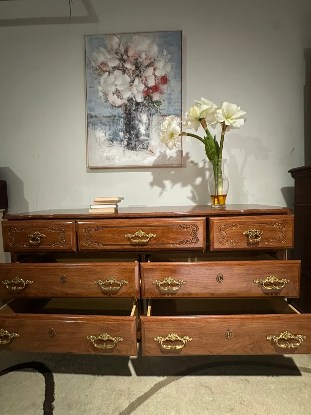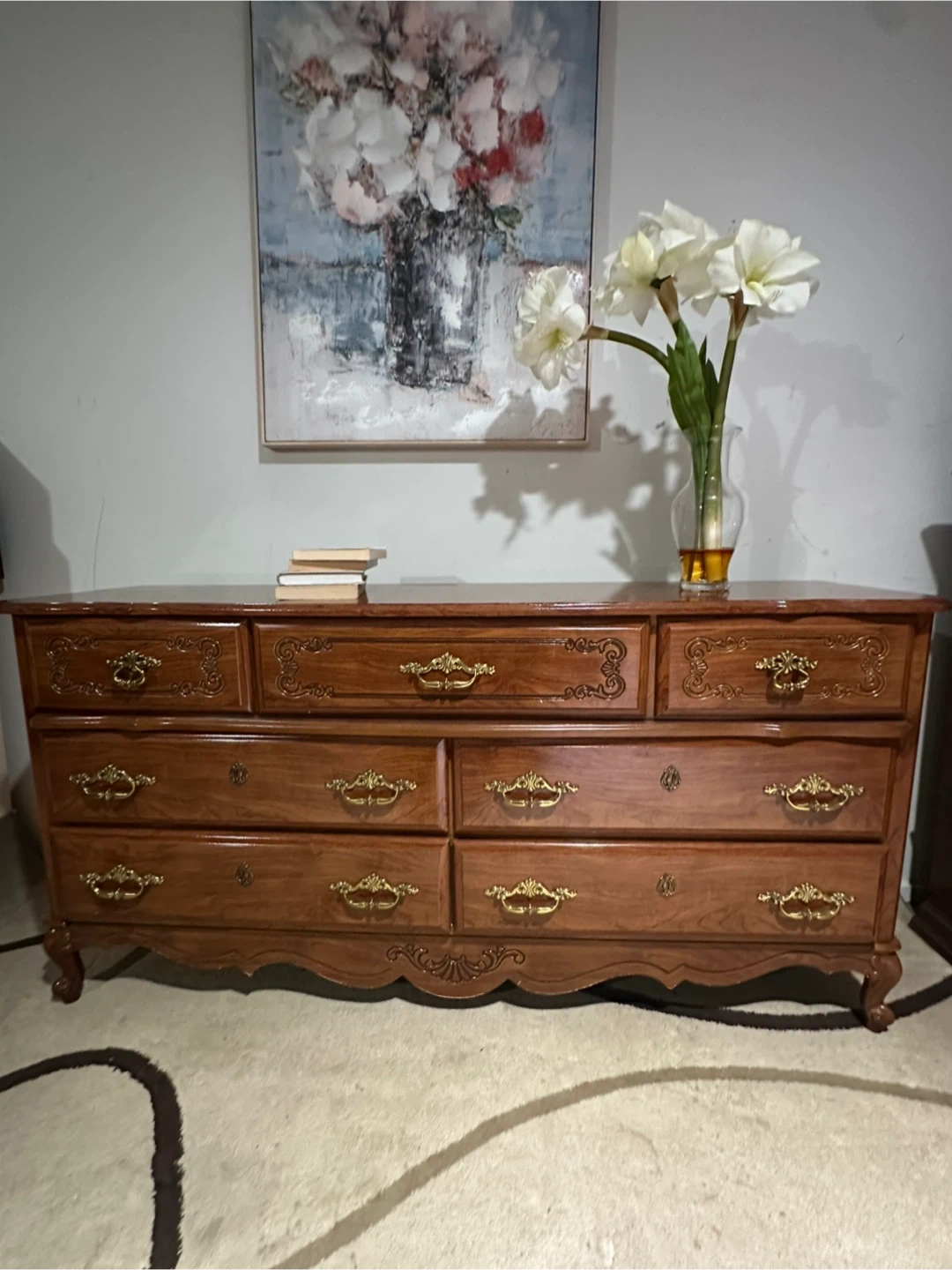 Beautiful vintage wood dresser with ornate details and gold-tone hardware. It has multiple drawers for ample storage. A classic piece to add character to any room!