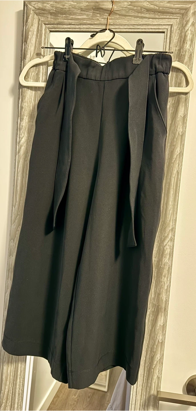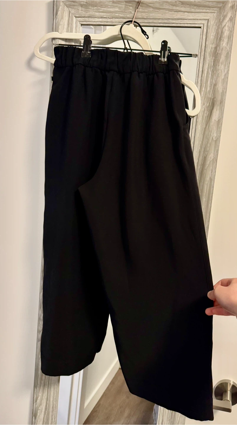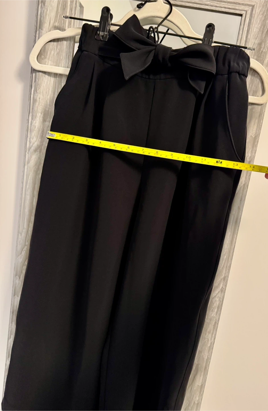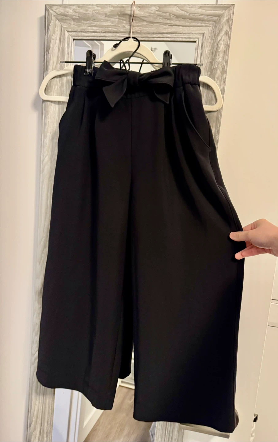 Selling a pair of black culottes! They feature a cute bow detail at the waist. The size appears to be around 31 inches. Great for a stylish and comfortable look!