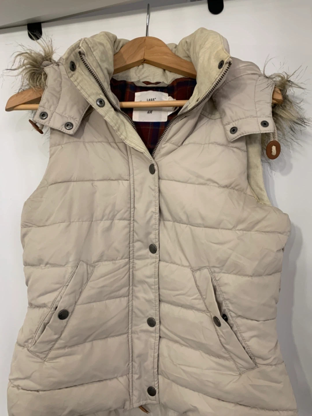 Selling a L.O.G.G. puffer vest in a neutral colour with a faux fur hood. It's a size US 6. Perfect for layering during the cooler months!