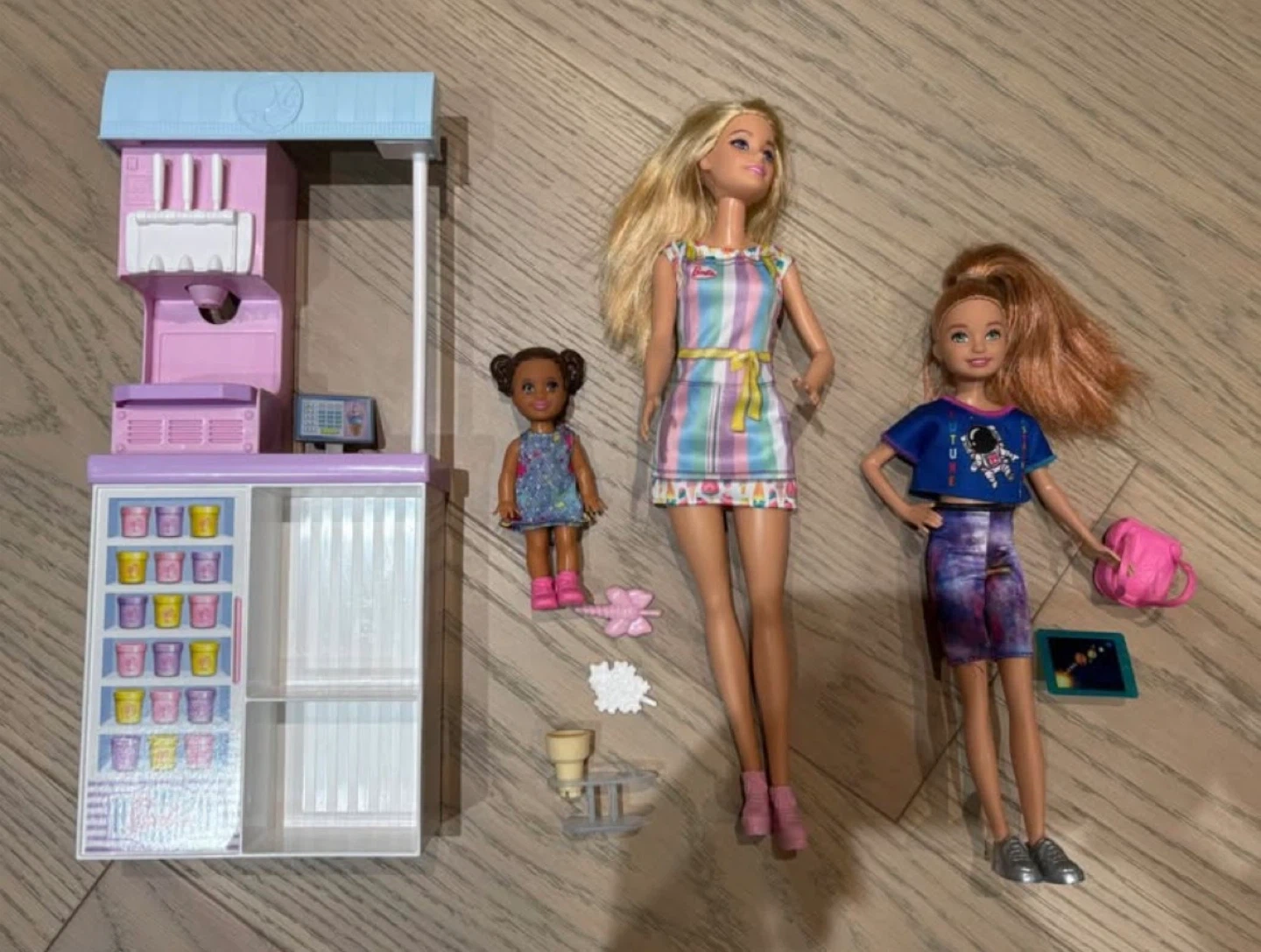 Selling a Barbie Chelsea doll and ice cream cart playset! Includes the Chelsea doll, two other dolls, an ice cream cart with accessories, and other small pieces for imaginative play. Great for kids who love Barbie and creative play!