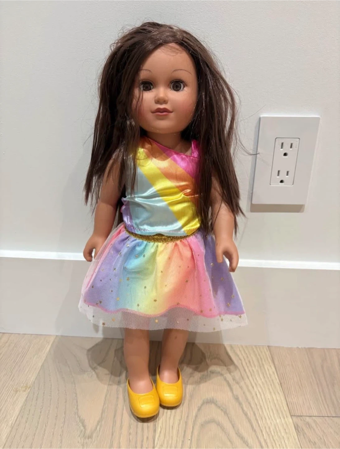 Selling a doll dressed in a vibrant rainbow dress and matching yellow shoes! She's in great condition and ready for a new friend. Perfect for imaginative play and doll collectors alike
