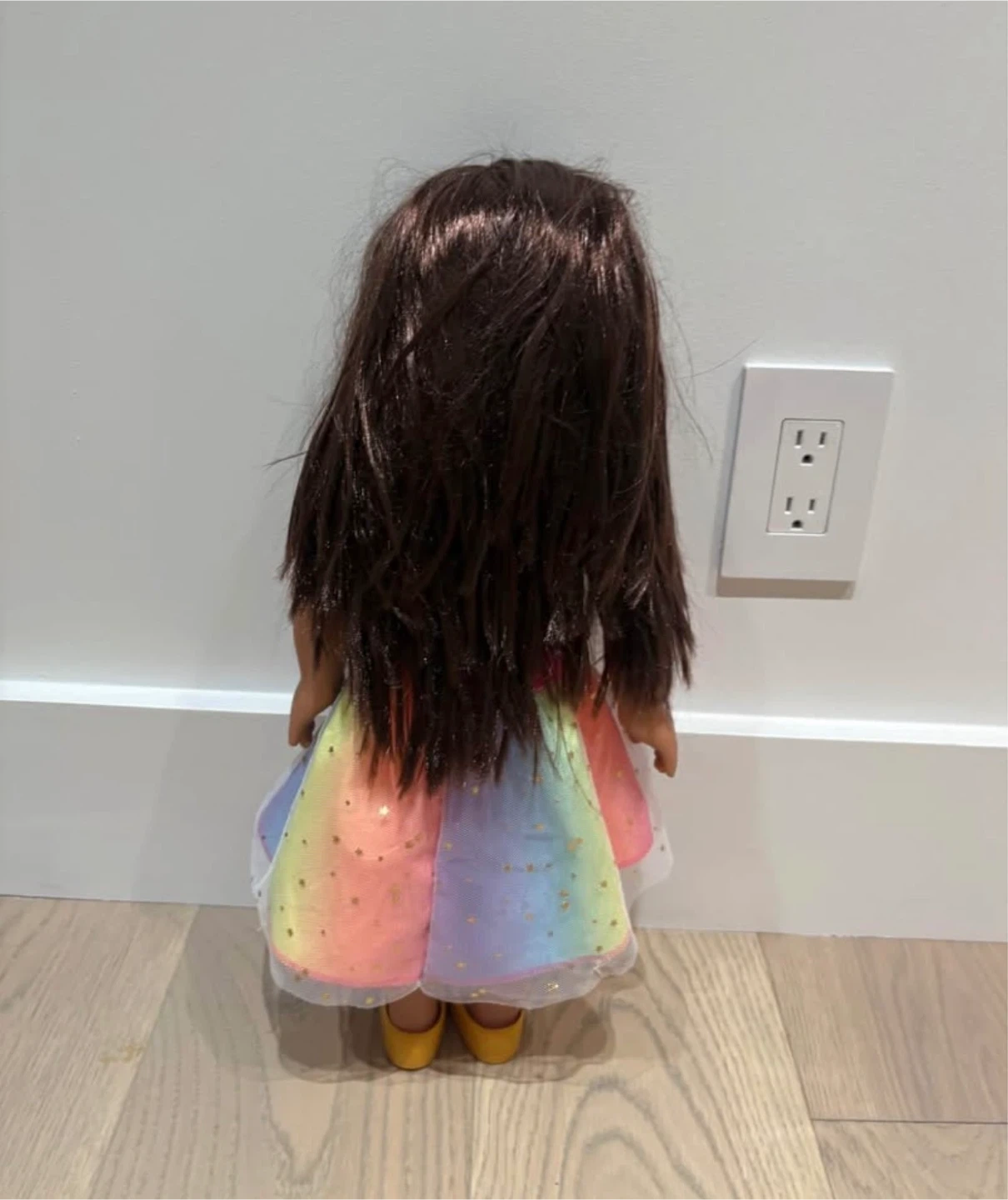 Selling a doll dressed in a vibrant rainbow dress and matching yellow shoes! She's in great condition and ready for a new friend. Perfect for imaginative play and doll collectors alike