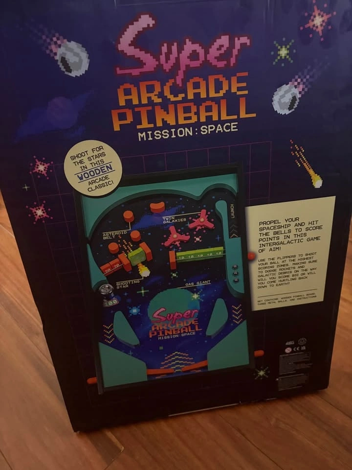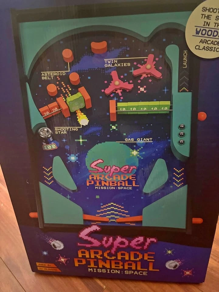 Bring classic arcade vibes home with this retro-style wooden pinball game featuring a fun space theme and bright pixel artwork.