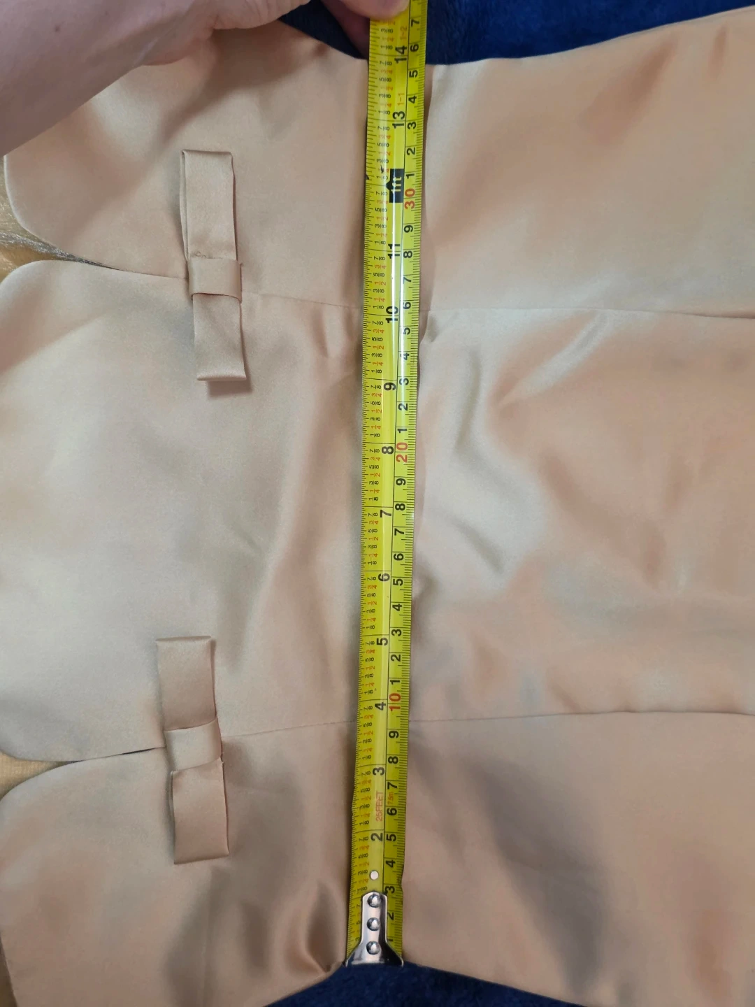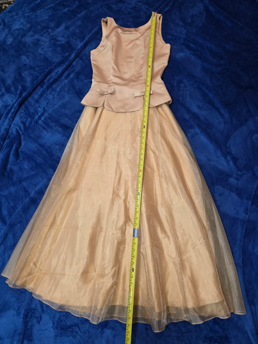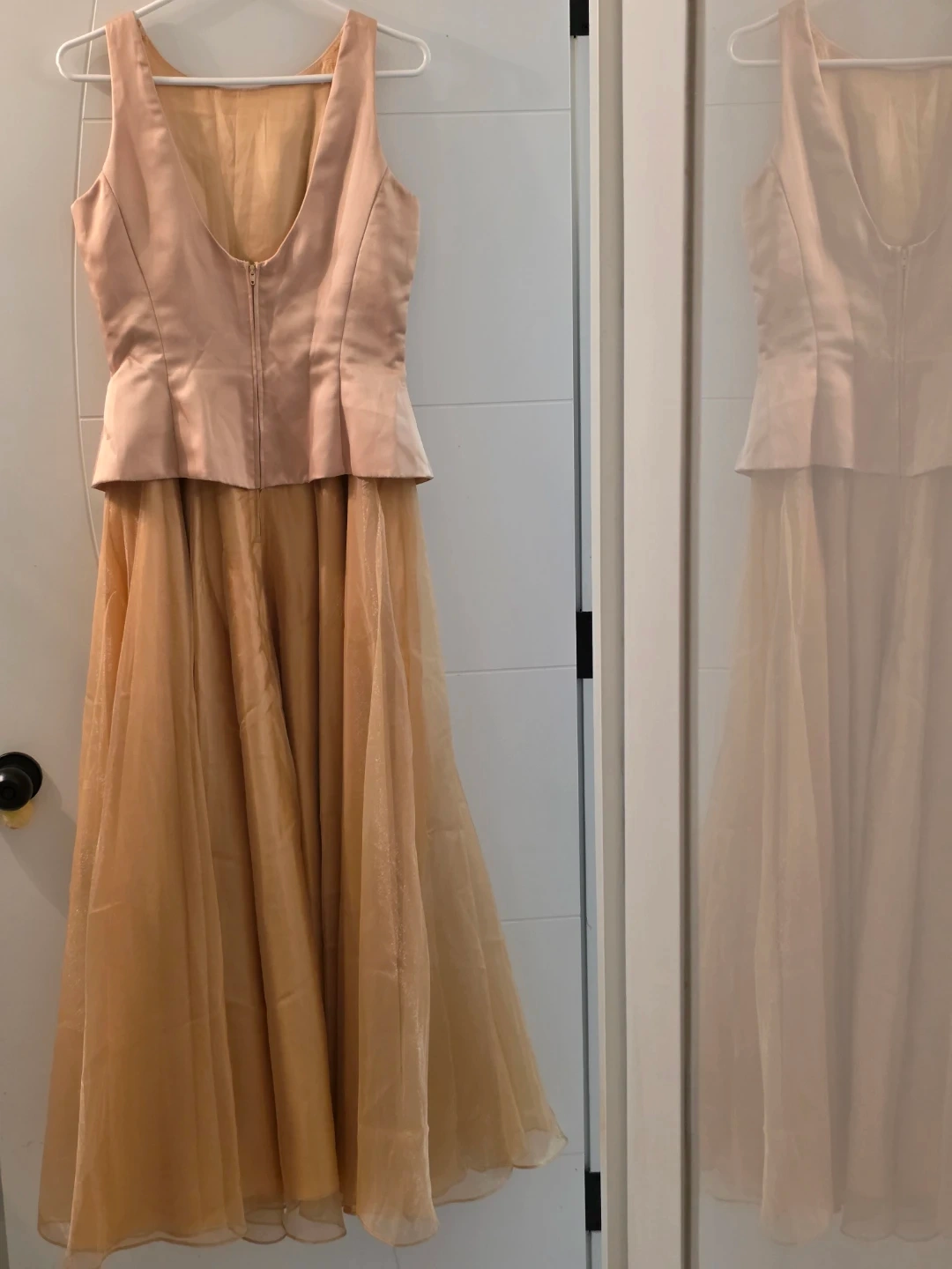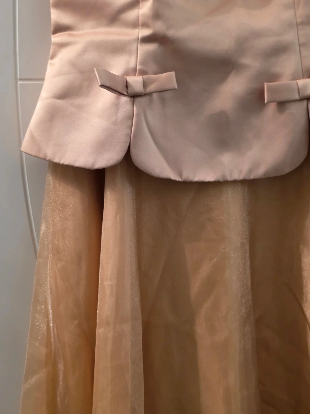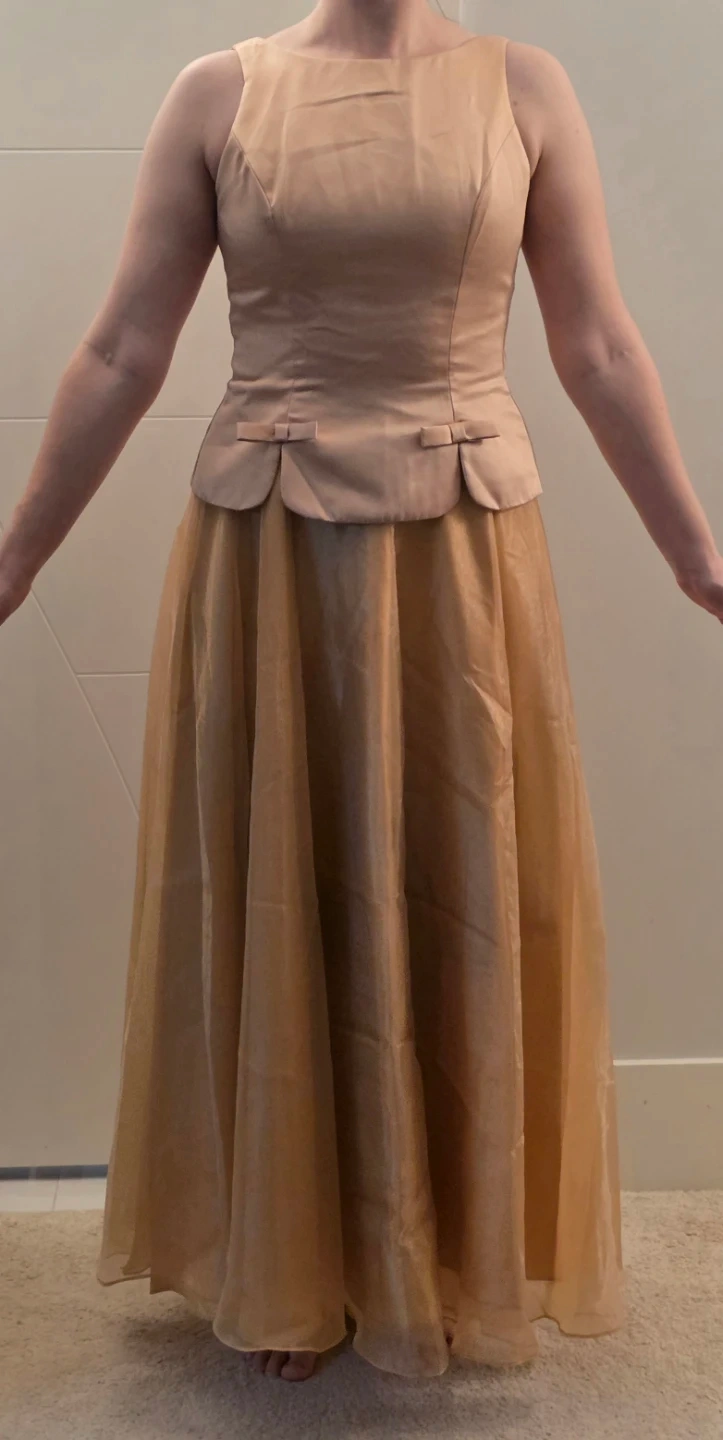 Selling a beautiful beige formal dress. It features a fitted bodice with a peplum detail and a flowing tulle skirt. Perfect for a special occasion!