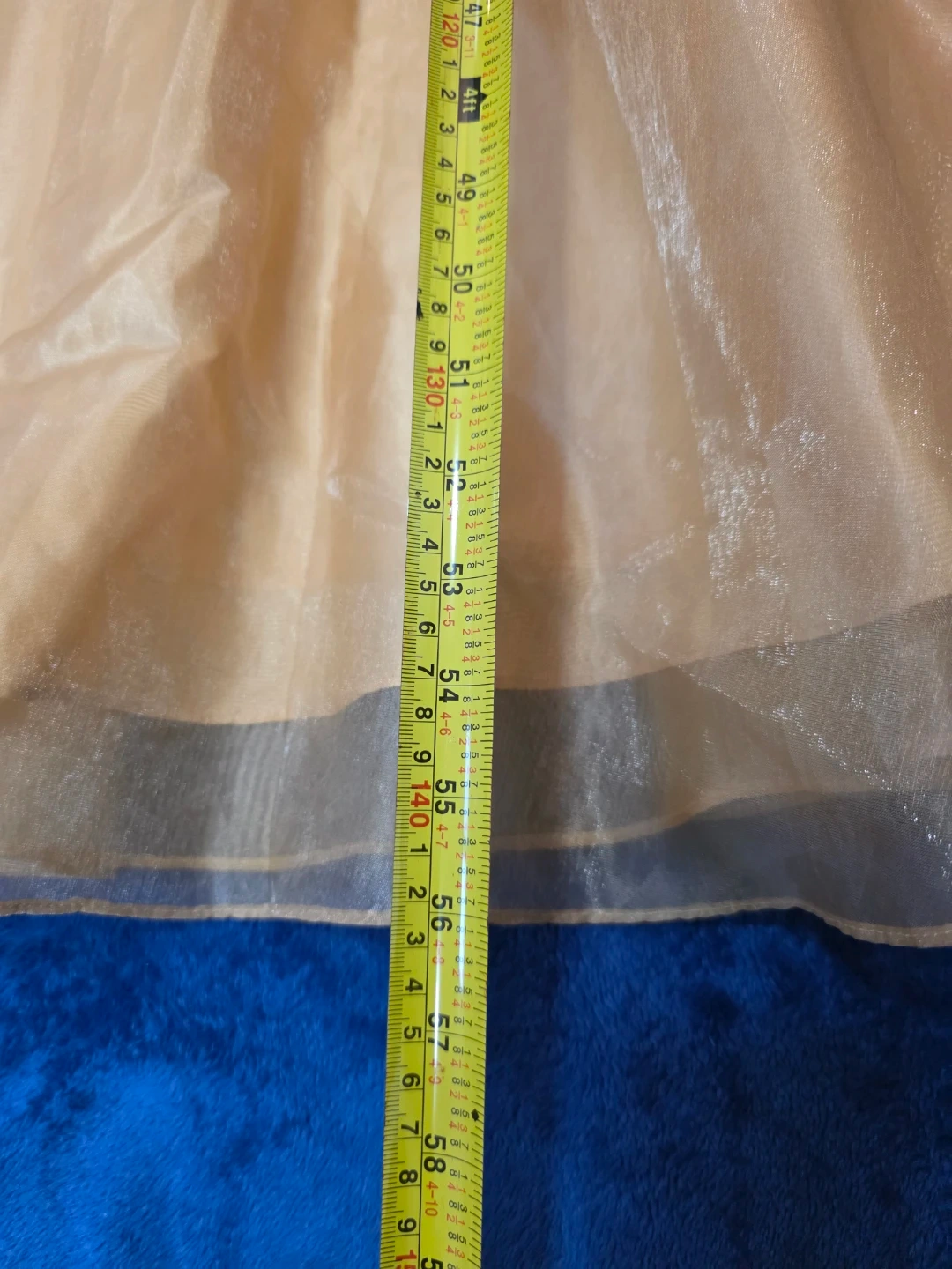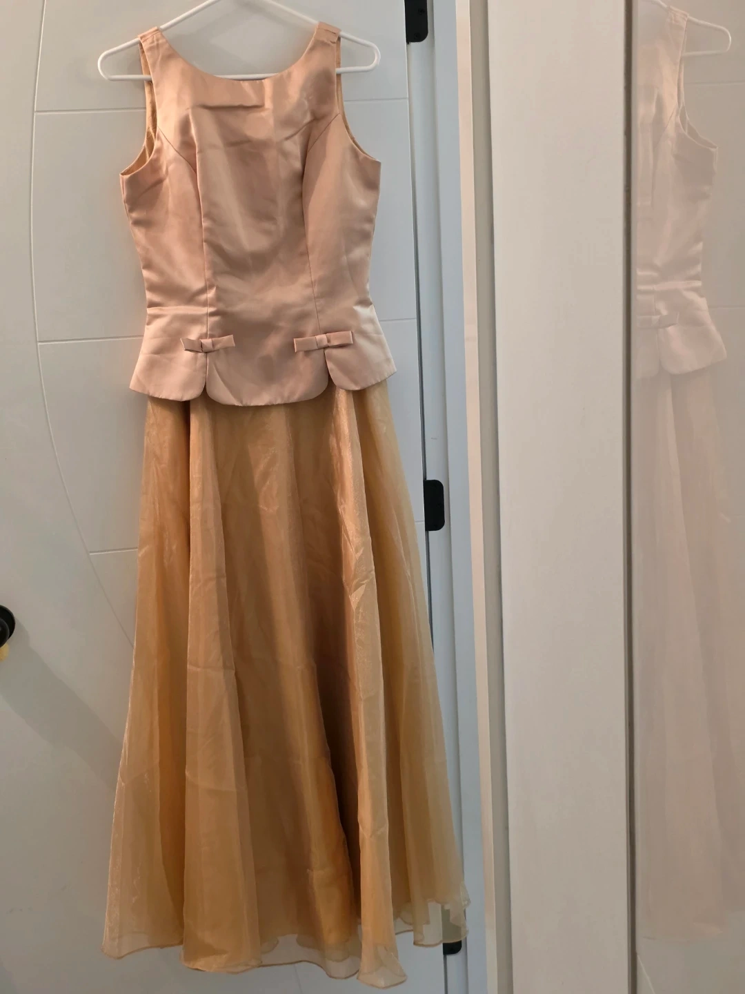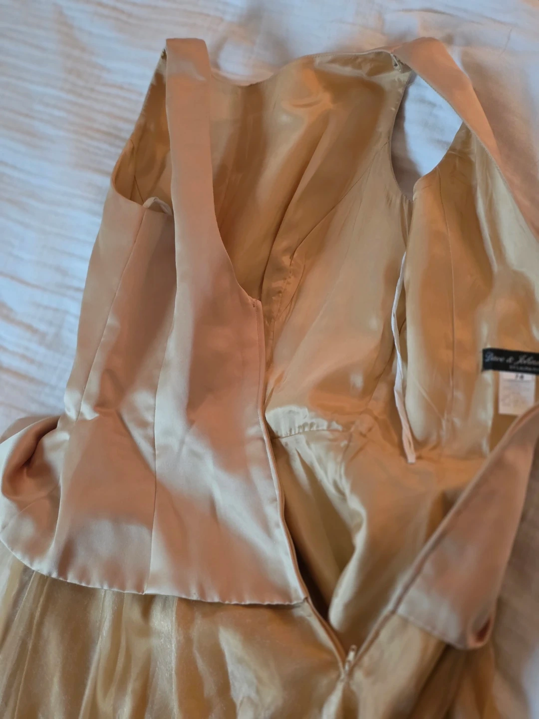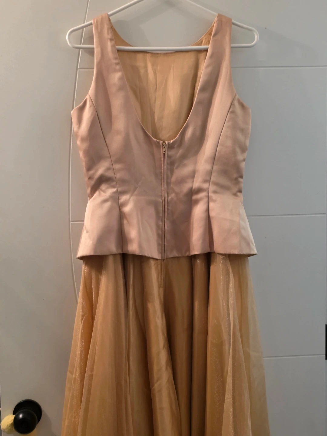 Selling a beautiful beige formal dress. It features a fitted bodice with a peplum detail and a flowing tulle skirt. Perfect for a special occasion!