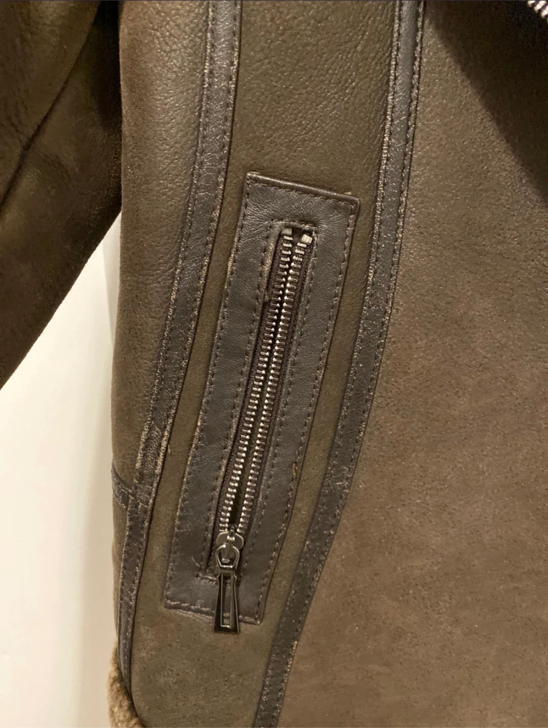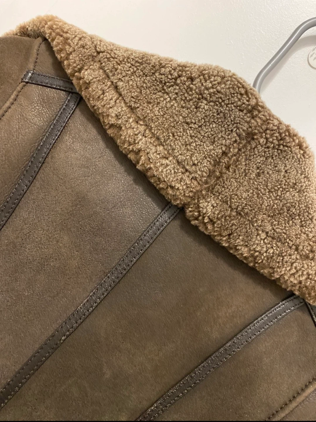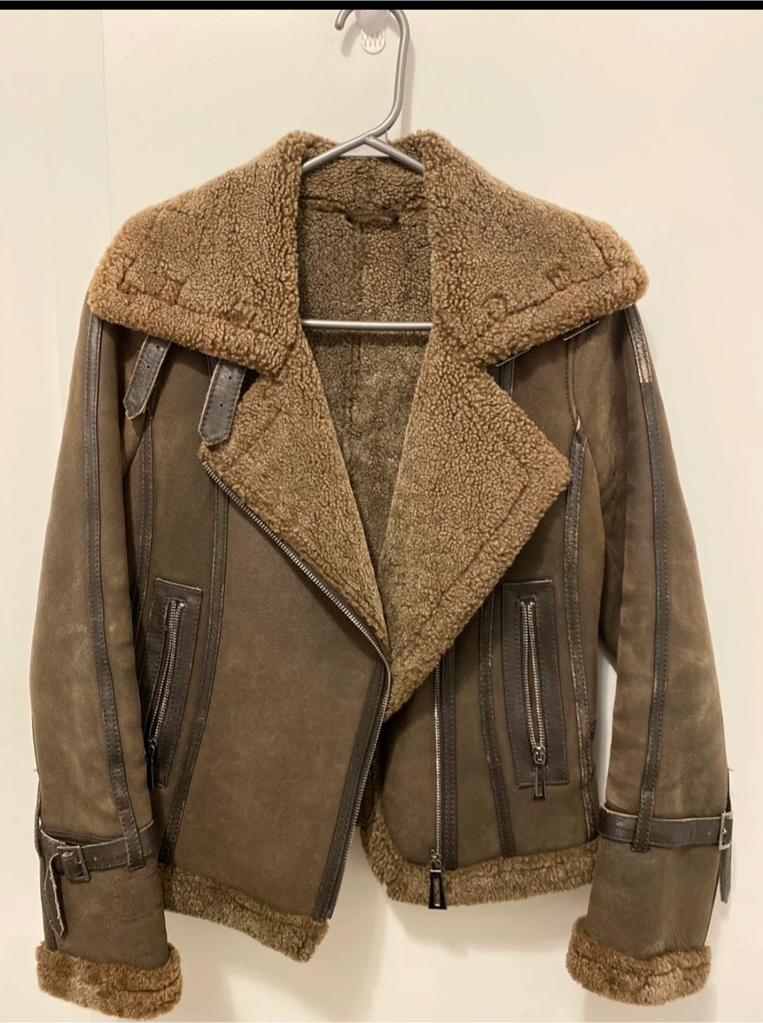 Selling a cozy shearling leather jacket in brown. It's in great condition and perfect for keeping warm during the colder months!
