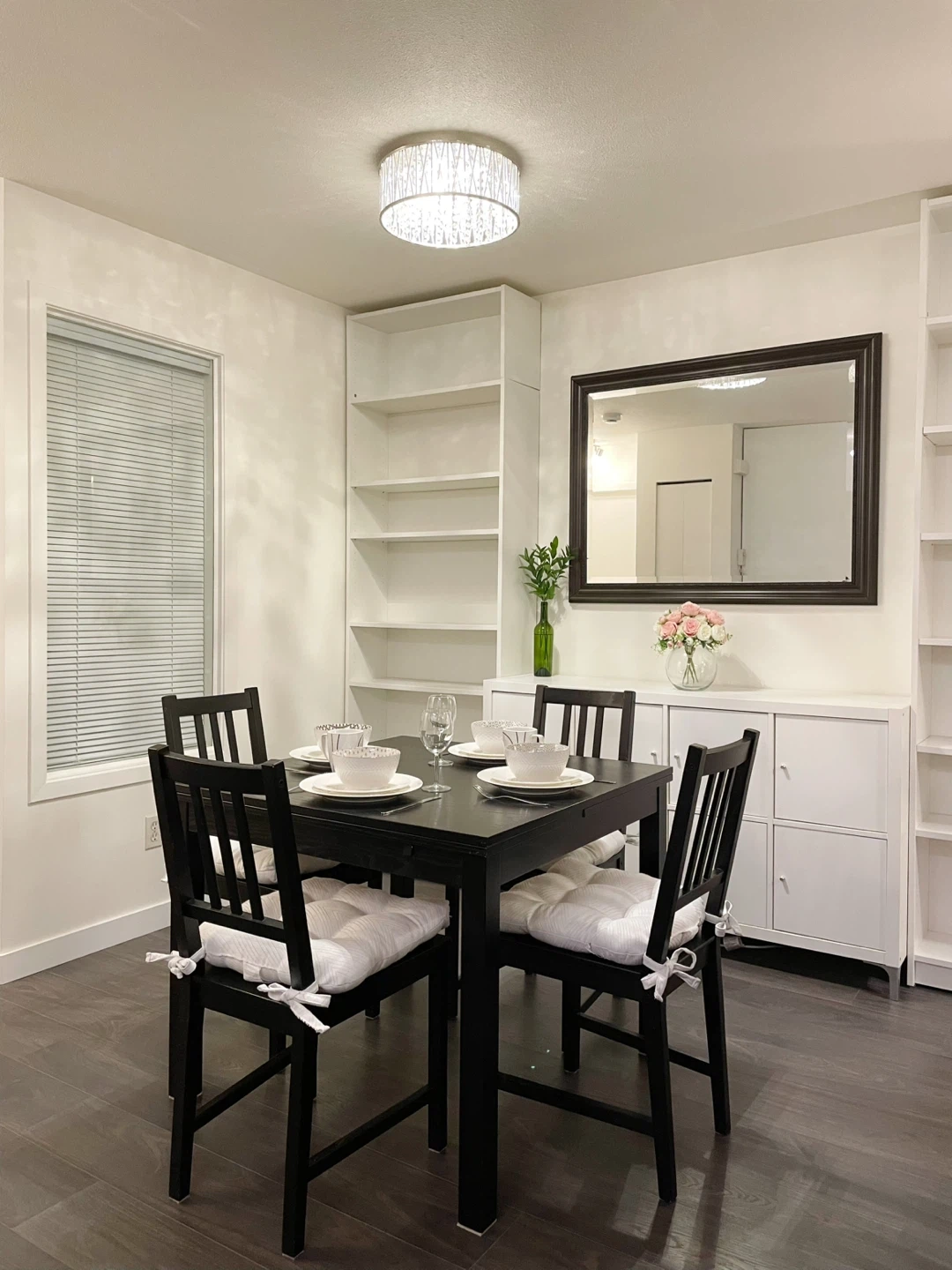 • Fully furnished with light fixtures: high end genuine leather sofa, TV, dining table set, double size bedroom set with bedding and brand new mattress