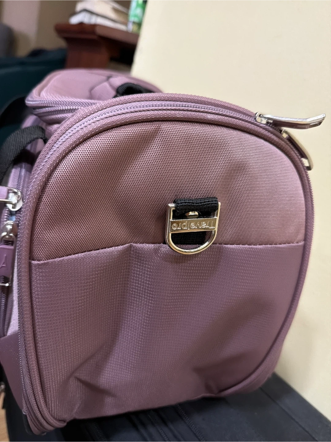 This is a Travelpro Maxlite 5 Softside Lightweight Underseat Carry-On Travel Tote, Overnight Weekender Bag, Orchid Pink Purple, 18 inch! It's in great condition and ready for your next adventure. It has a spacious interior with a patterned lining. Perfect for weekend getaways or as an extra bag for longer trips