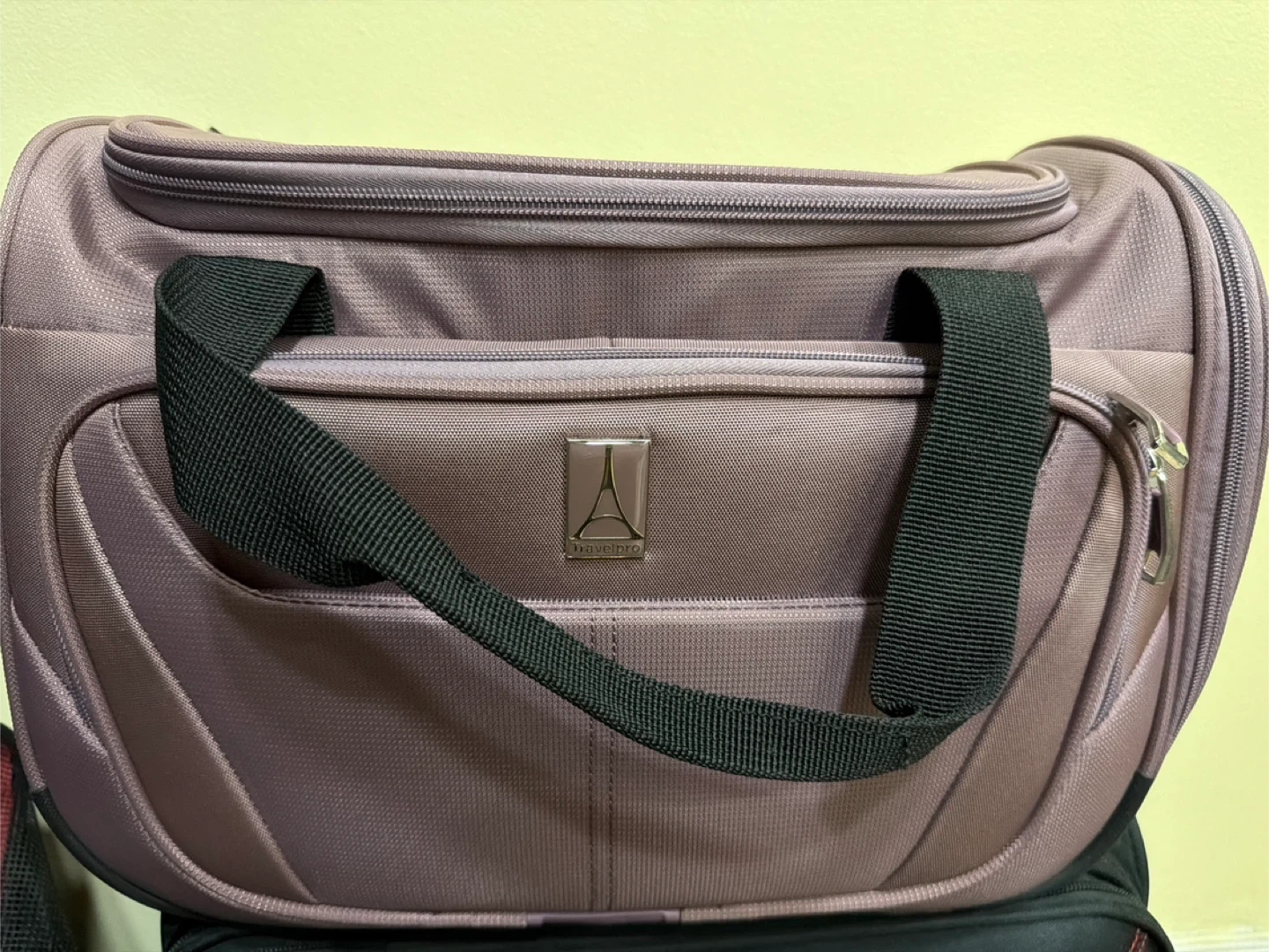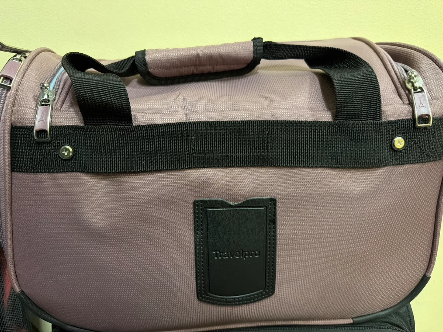 This is a Travelpro Maxlite 5 Softside Lightweight Underseat Carry-On Travel Tote, Overnight Weekender Bag, Orchid Pink Purple, 18 inch! It's in great condition and ready for your next adventure. It has a spacious interior with a patterned lining. Perfect for weekend getaways or as an extra bag for longer trips
