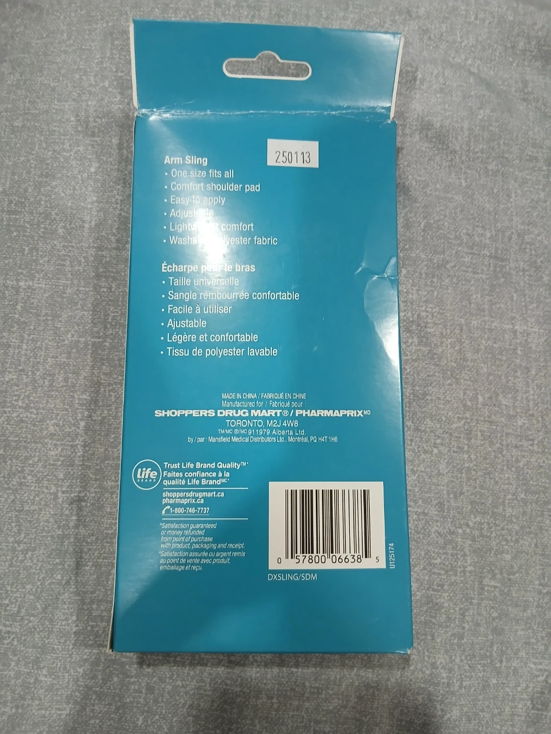 Selling a Life Brand arm sling, one size fits all. It comes in its original box and features an adjustable and padded design for extra comfort. It's lightweight and made of washable polyester fabric. Great for anyone needing support for their arm!