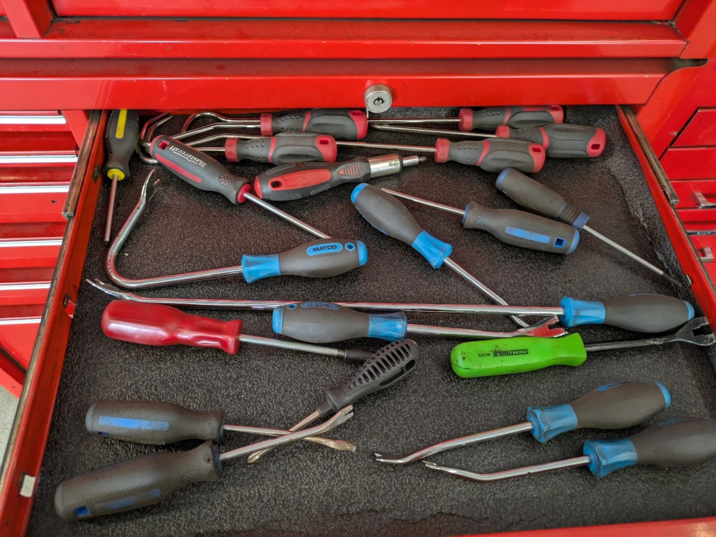 Selling a red Snap-on tool chest. It's in used condition and has lots of space for all your tools. It includes various tools inside the drawers.