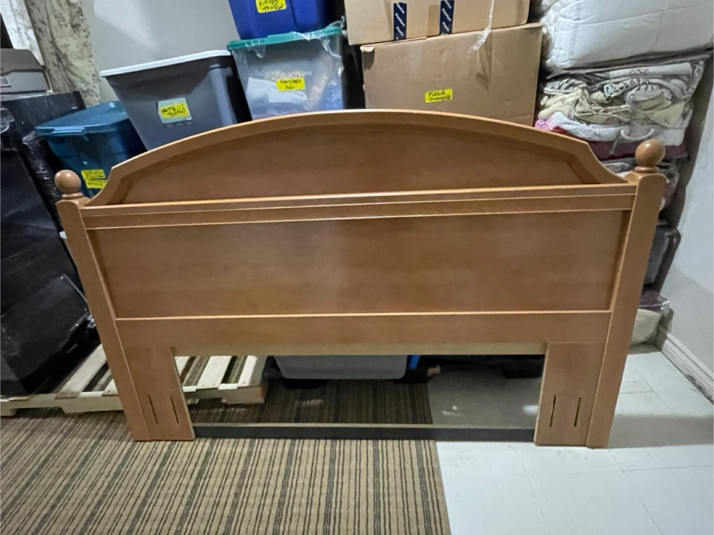 Selling a wooden headboard in good condition. It has a classic design with a curved top and a light wood finish. Perfect for adding a touch of warmth to your bedroom!