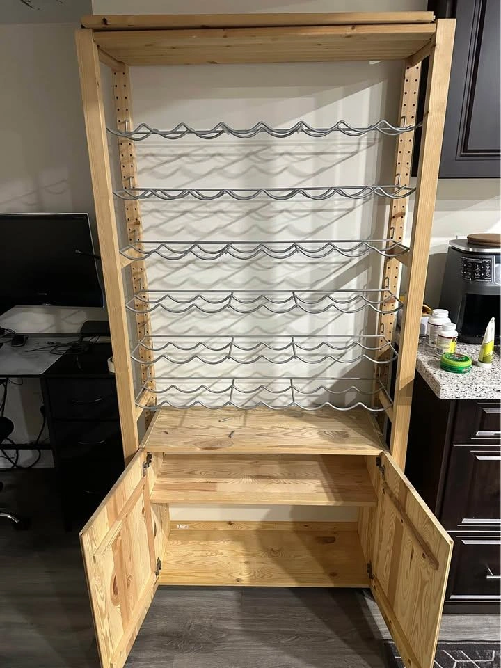 Sold pine wine rack. Holds 48 bottles and more below in cabinet. Easy to transport and will be disassembled.
