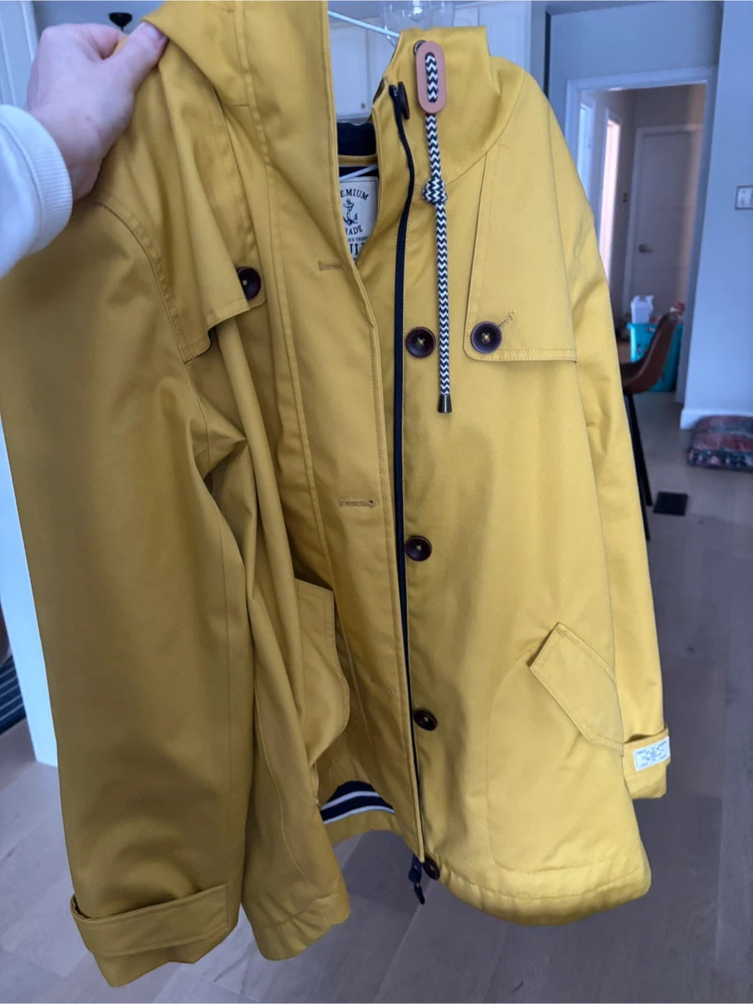 Selling a Joules waterproof and breathable jacket in yellow! It's a size UK 16, EU 44, US 12. This jacket is perfect for those rainy days!
